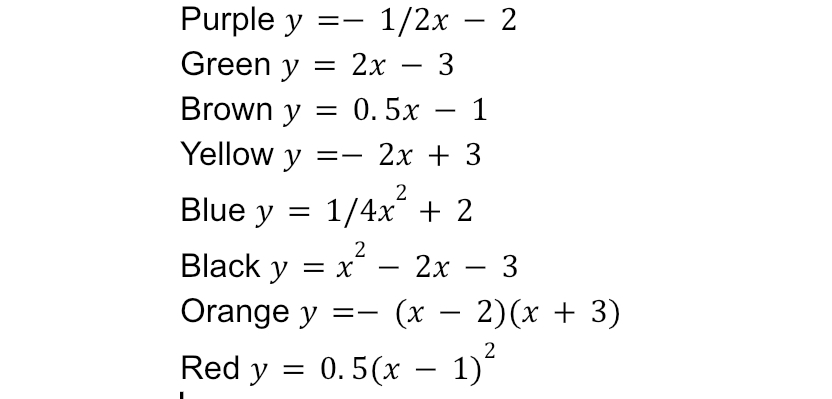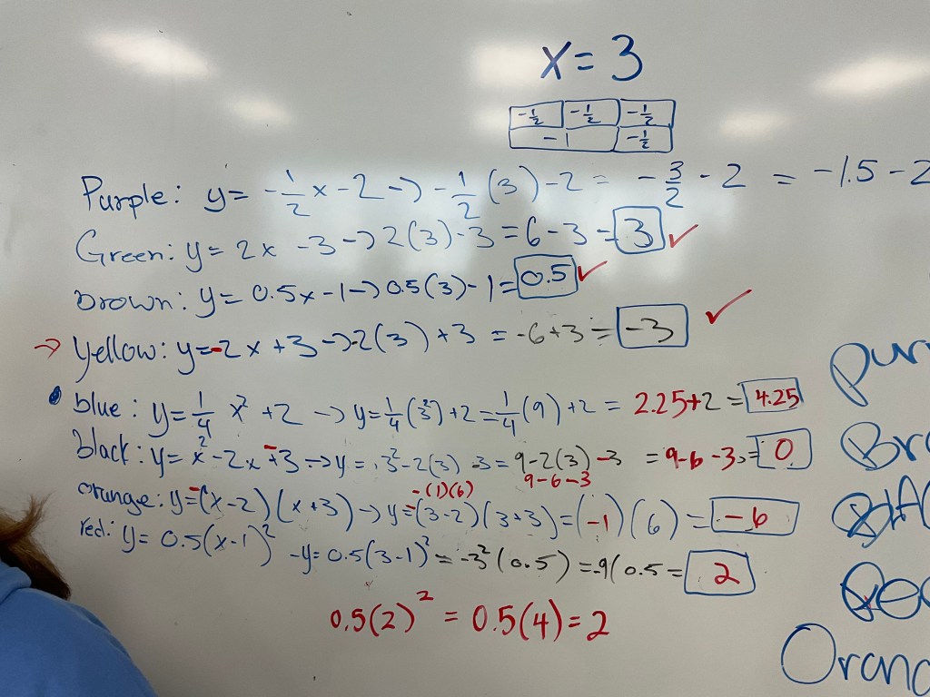 We next got split up into 7 groups. Each group got assigned an x value to plug into each of the following equations. We used x values of -3, -2, -1, 0, 1, 2, 3