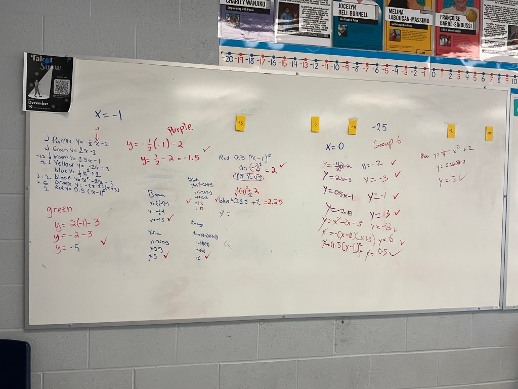 Today in grade 10 we started off by solving equations at the walls. We had enough space and markers for each student to write and practice solving. We solved equations with x on both sides, and worked our way up to solving equations with distributive property as well.