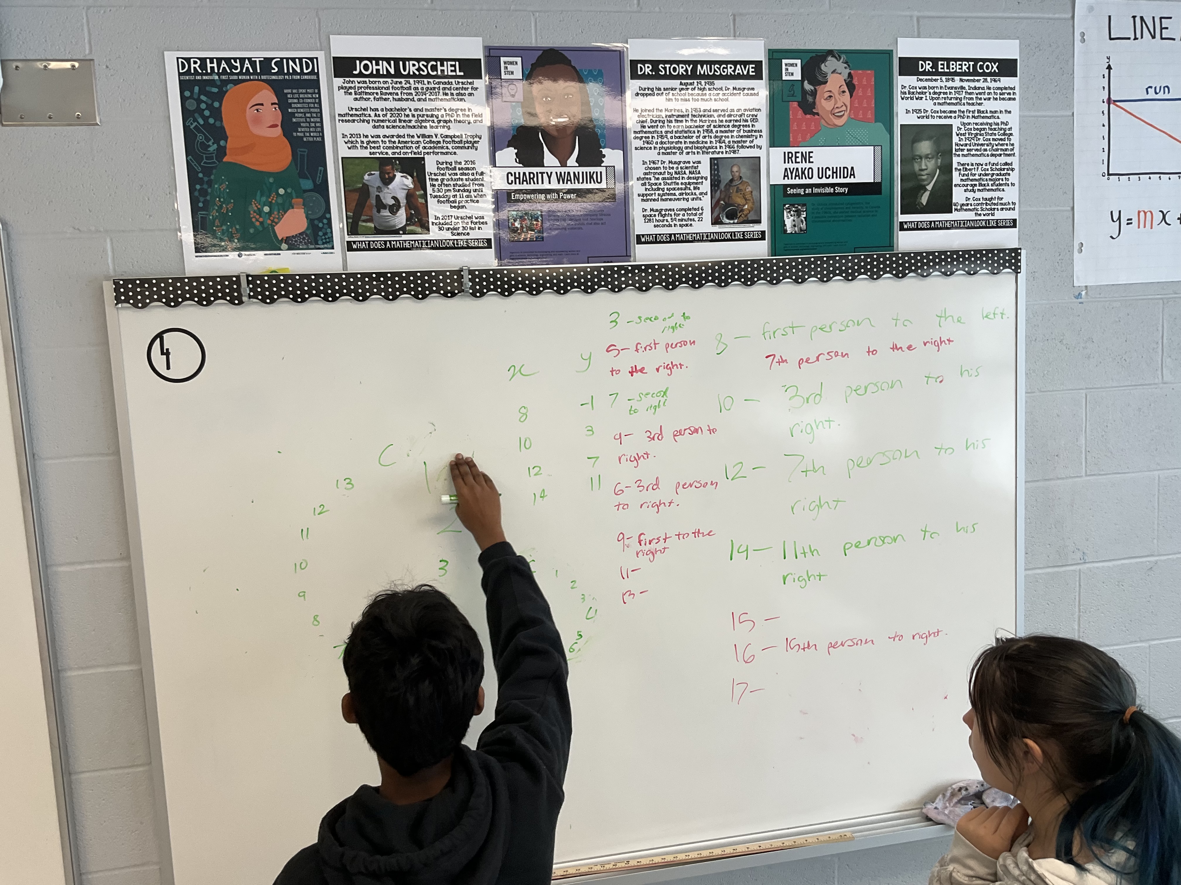We needed to decide on a common way to discuss the issue, and came up with tracking how many spots to the right or left of the captain that he should point to start the eliminations. We worked on ways of drawing and tracking information, and then looked for patterns.