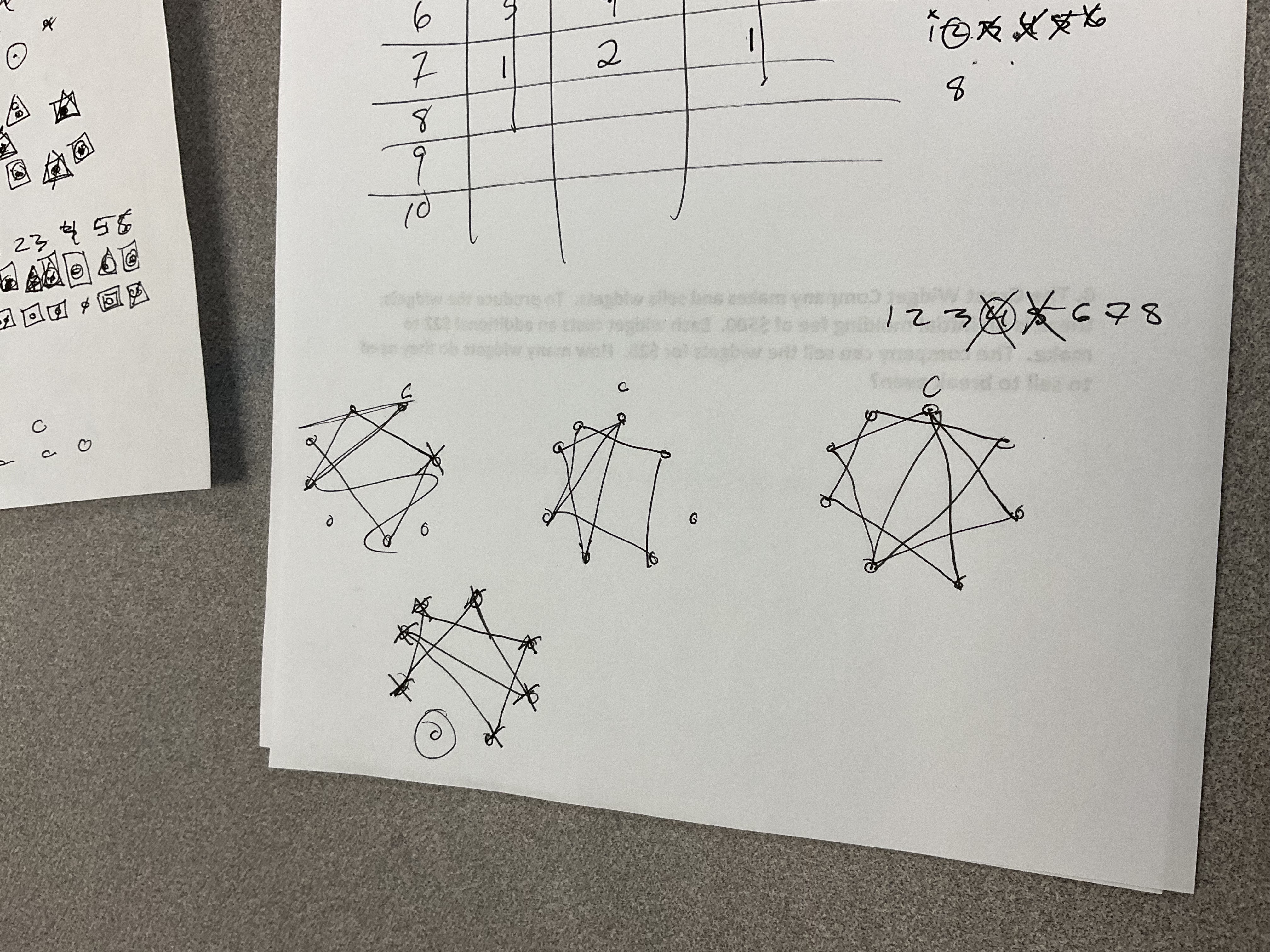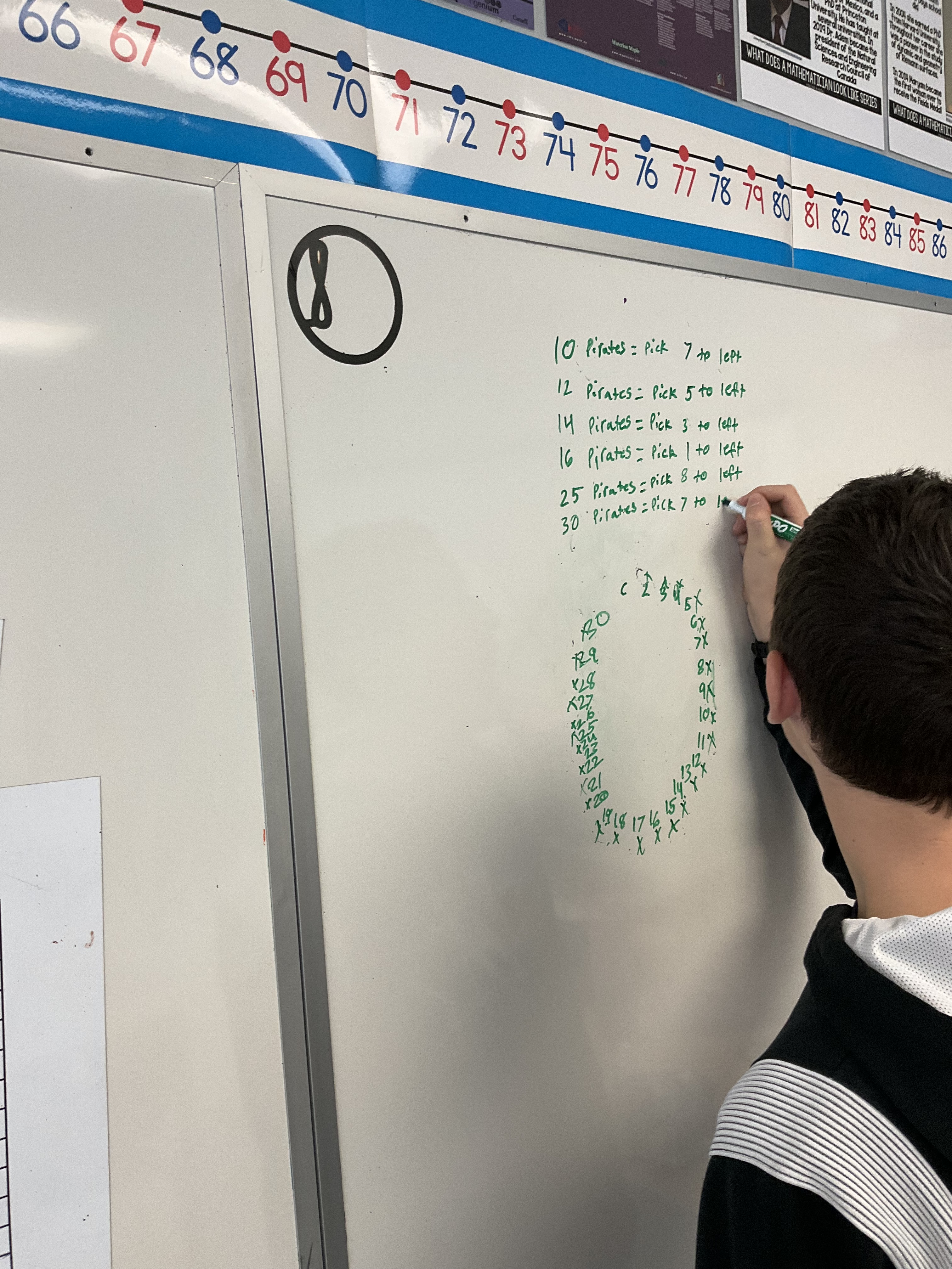 We took time to explore the problem, and figure out how to keep track of our data and how to extend the patterns that we saw. Some groups didn’t want to start with 10 pirates, they started with a smaller case of 4 or 5 or 6, which in this case doesn’t clarify the situation as much as might be hoped. One group started off with a general case of n pirates which is quite an overwhelming task.