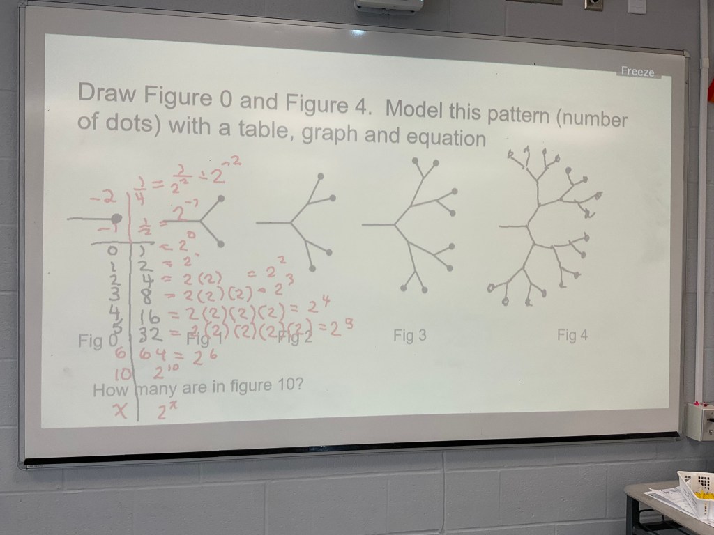 Students had great success with making tables and spotting that the number doubled and doubled and doubled as we got higher figure numbers. It took a minute for some to connect that with writing repeated (2)(2)(2)(2) and making it 2^x. Students graphed for a positive domain quite readily, but needed a push to think about if the domain of this would be positive x only. The visual patterning breaks down, but the equation continues, and we got there by using the tables. As you go down the table (for larger x values) we multiplied by 2 each time. To go up the table (for smaller values of x) we divide by 2 each time.