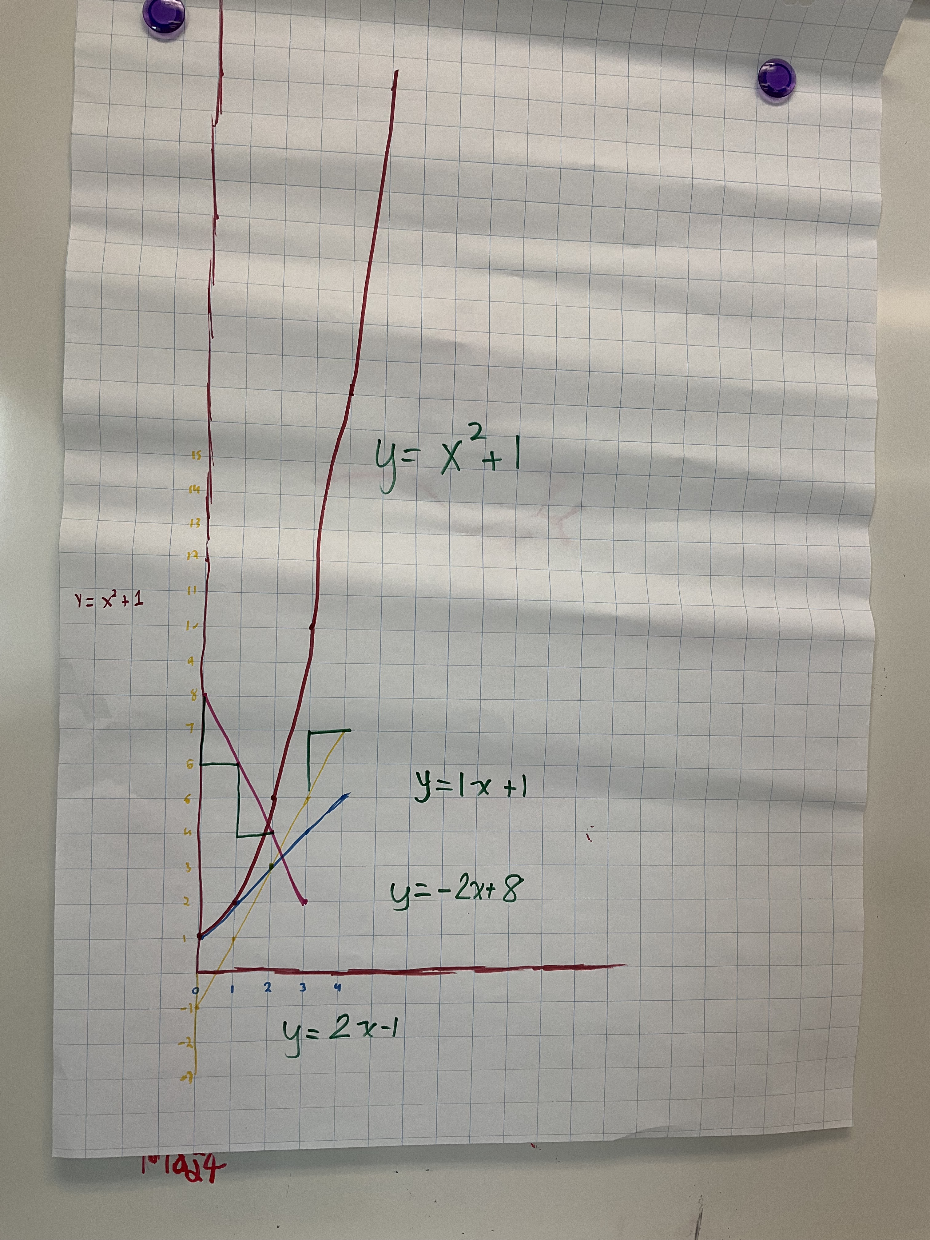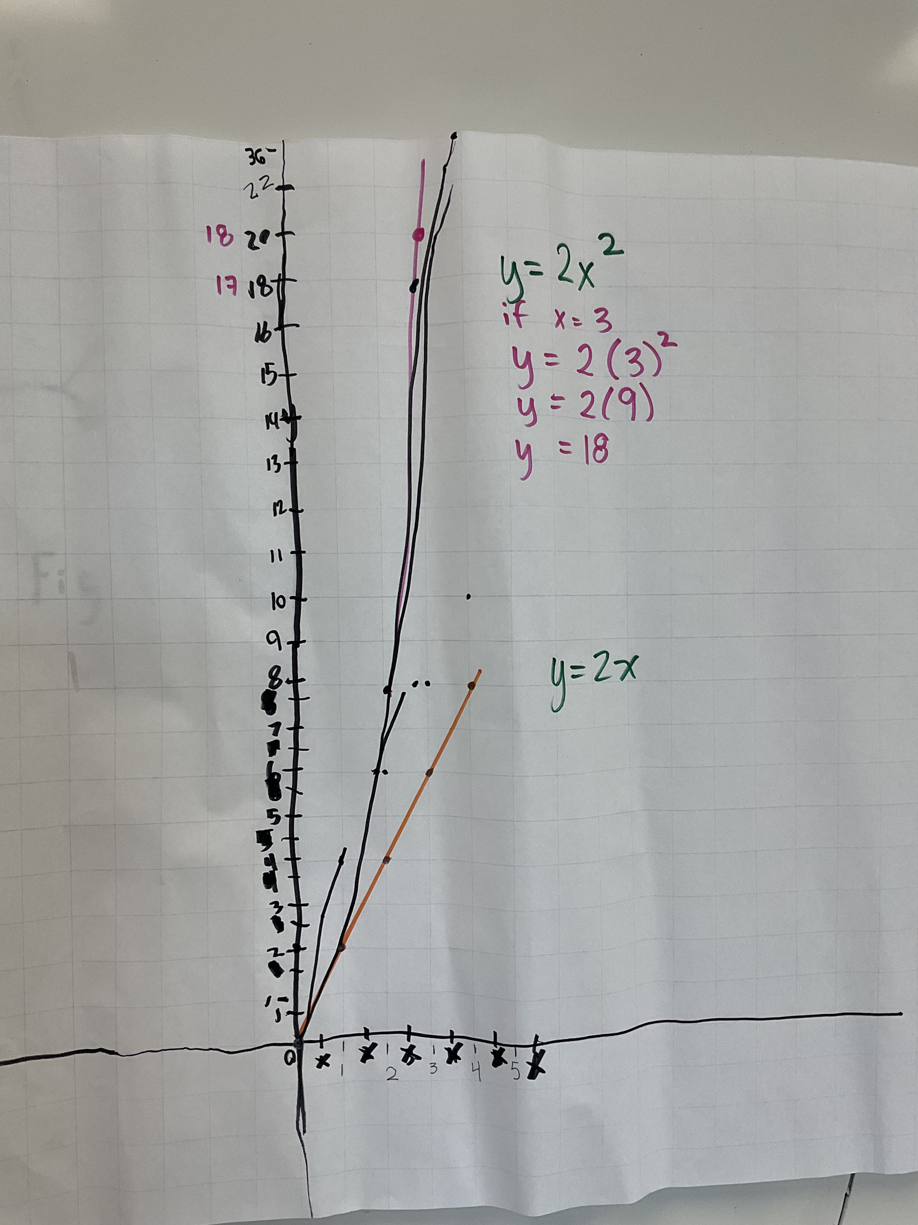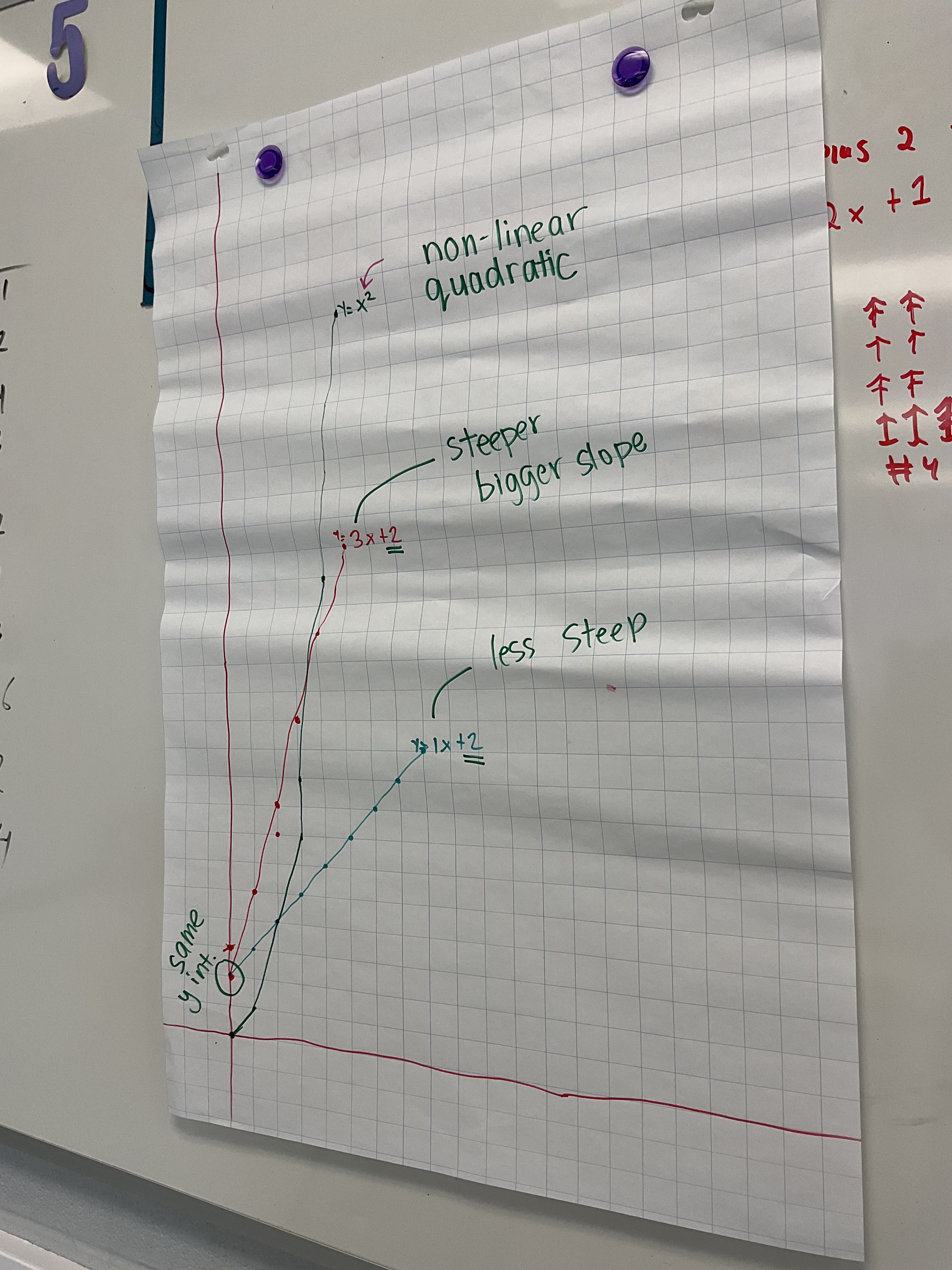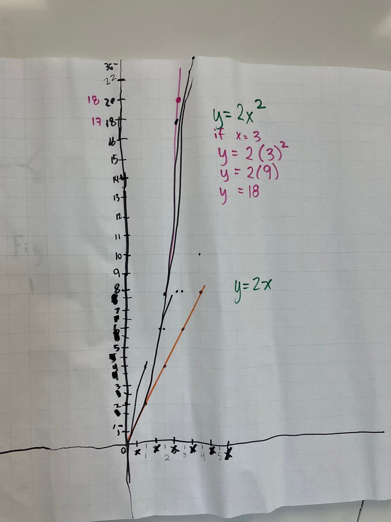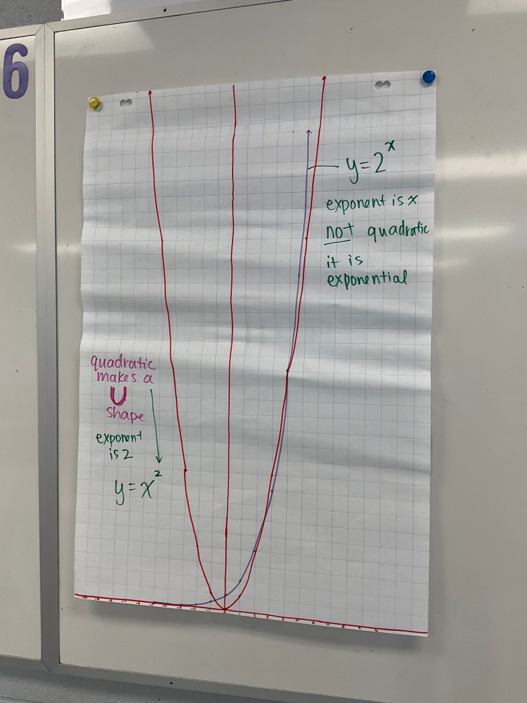We could see how same slopes, and same y intercepts impact graphs. We could see the difference between x^2 and 2^x as well. I’ve done this task with lines often, but I am enjoying how many functions we could explore with this method.