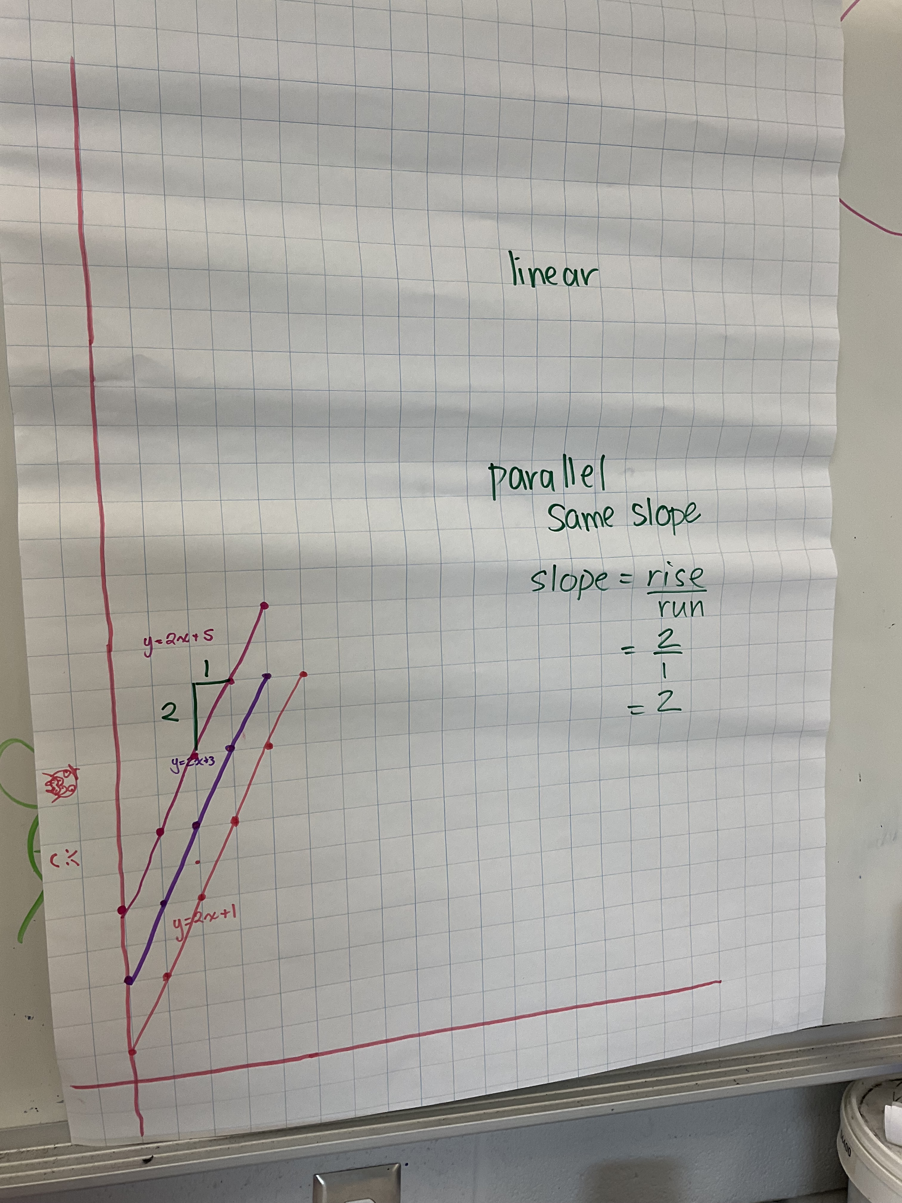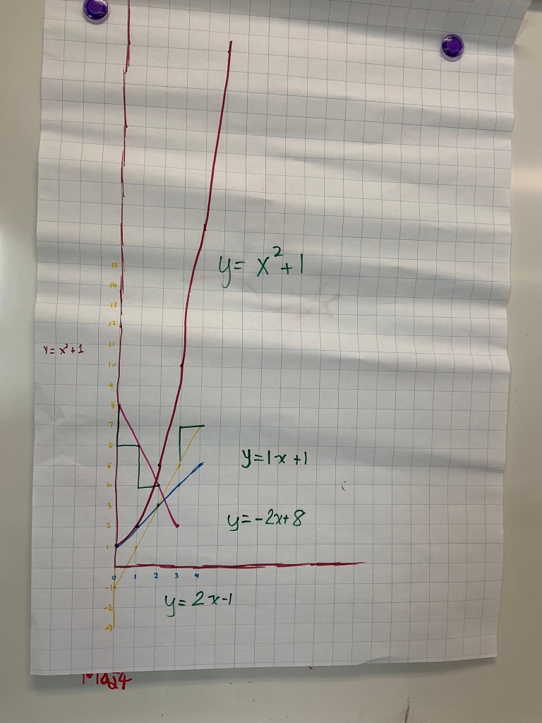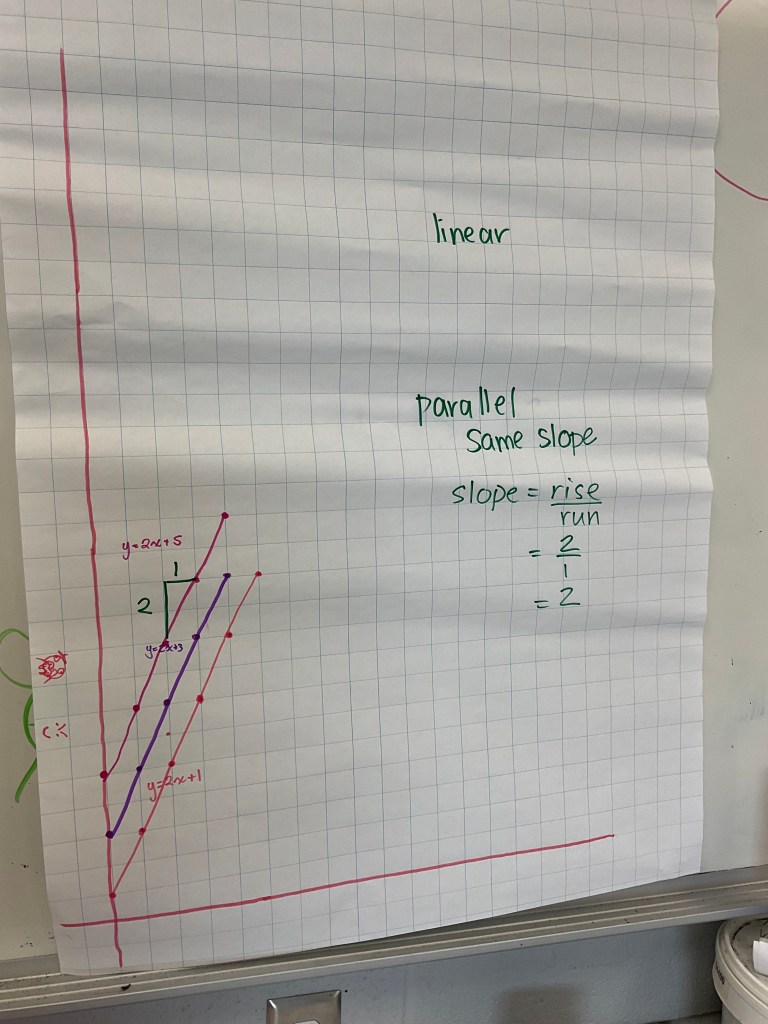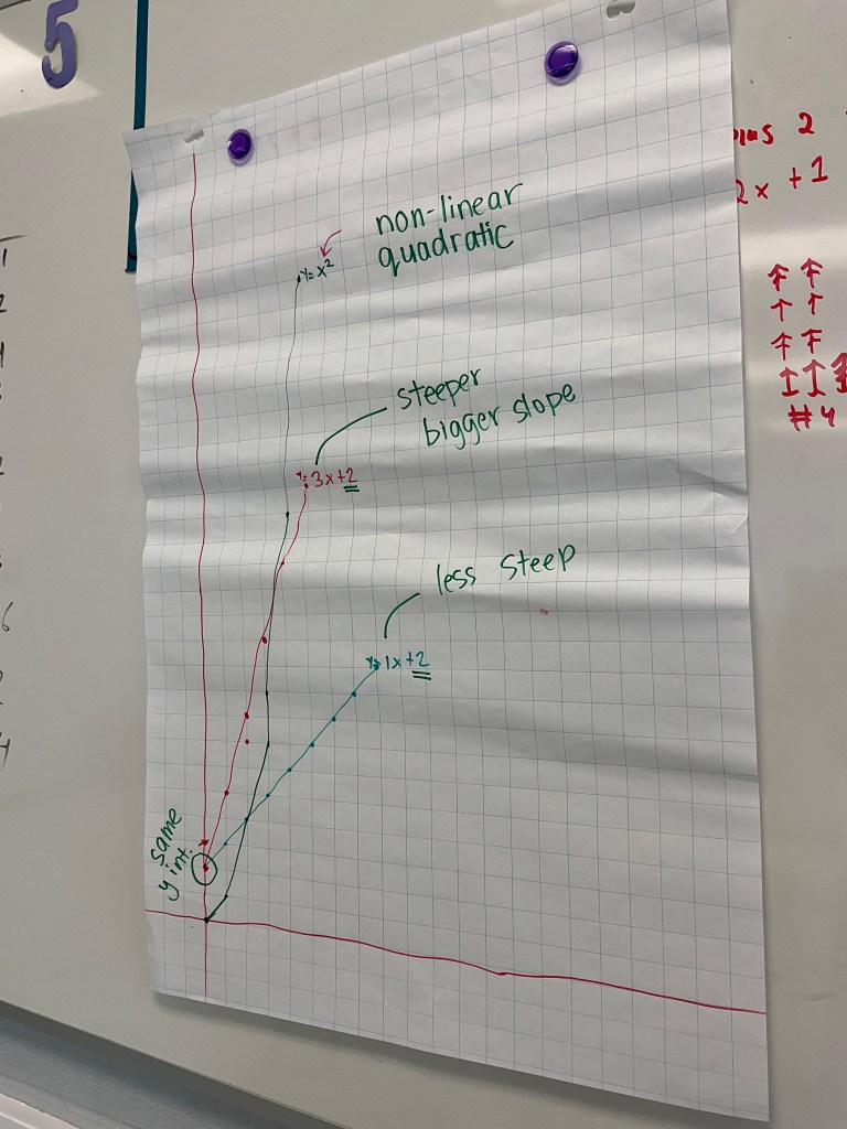 We explored slope, steepness, parallel, positive vs negative, we looked at y intercepts, what the equation looked like if there was no “b” value (passed through the origin), or if the b values of 2 lines were the same, that’s their intersection point. We found other intersections, some by estimating. We showed what it means for a point of intersection to satisfy both linear equations. Some groups showed really good rise and run. We had some groups working on fractional slopes and non-linear patterns too by the end of the class. I hope this helps connect some of the patterning and graphing we’ve been working on this week. Tomorrow we will explore some more with desmos.