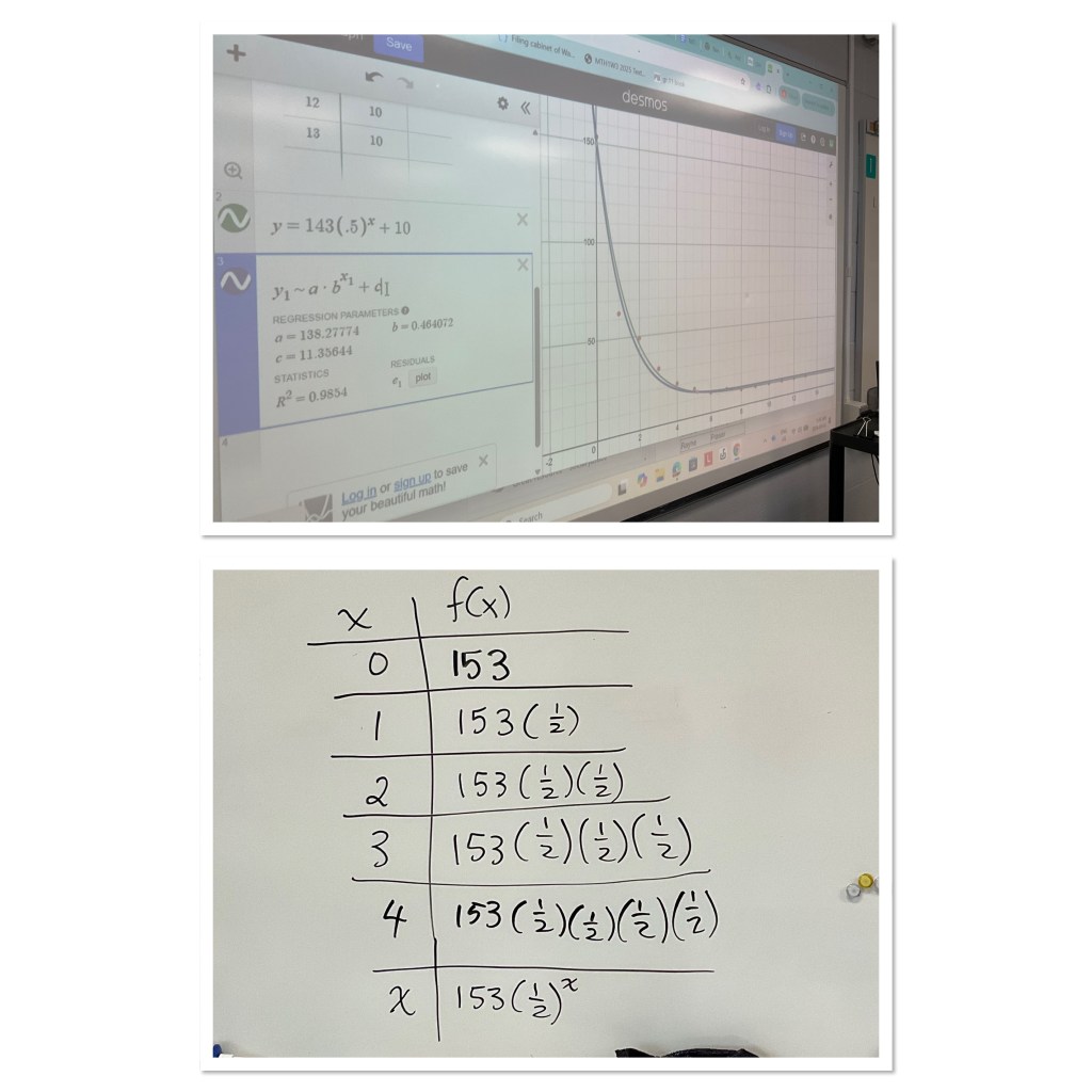We had light bulb moments as we saw the numbers getting smaller and smaller and smaller, as we divided by 2 each time. They made connections to graphical features saying there’s an asymptote, and telling that the range is y>0 but not equal to 0.