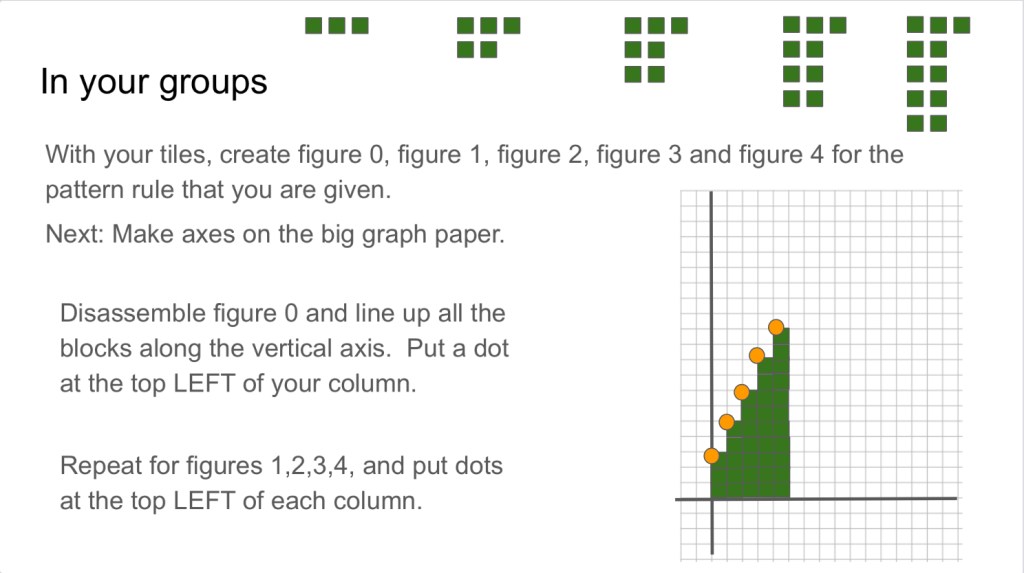 Each group then took the tiles off their pages, and connected the dots to make their graphs complete. We repeated the process with another pattern rule or two all on the same grid. I planned ahead to make graphs that are interesting to compare, and that would bring forth a lot of vocabulary and concepts. We put all of the papers up on the whiteboards and did a group consolidation. Here’s a gallery of what we looked at. Some groups had asked for some spicy challenges!