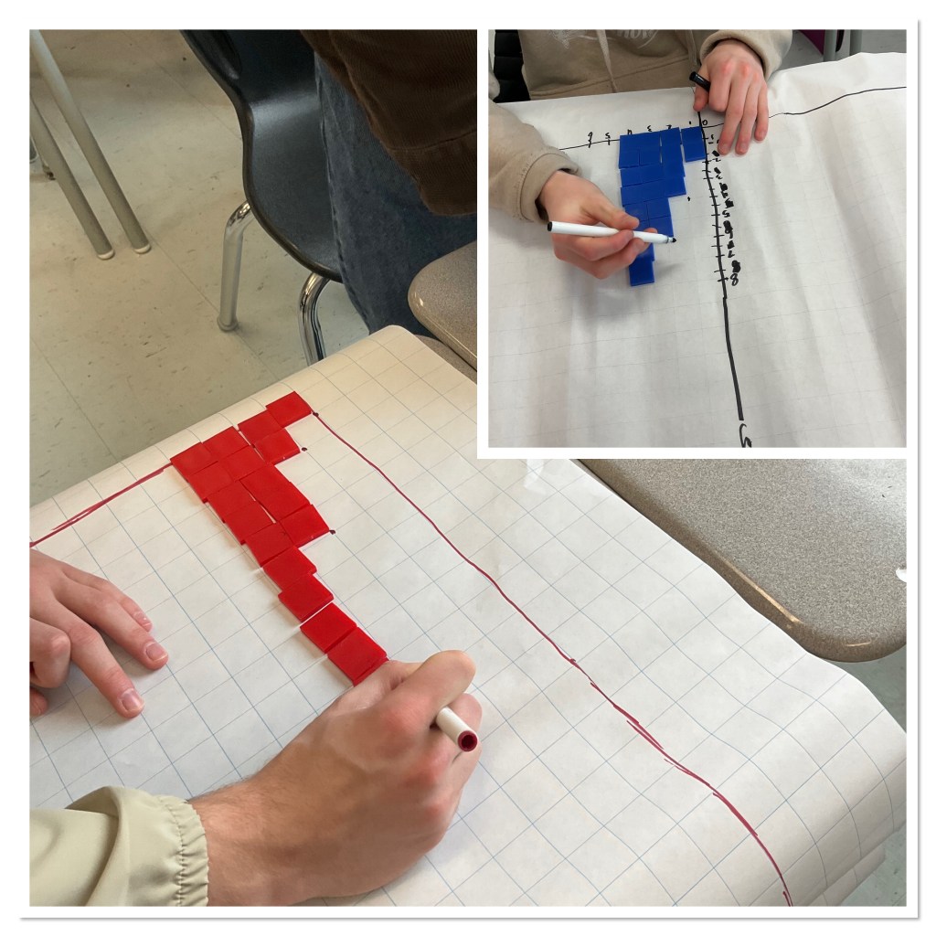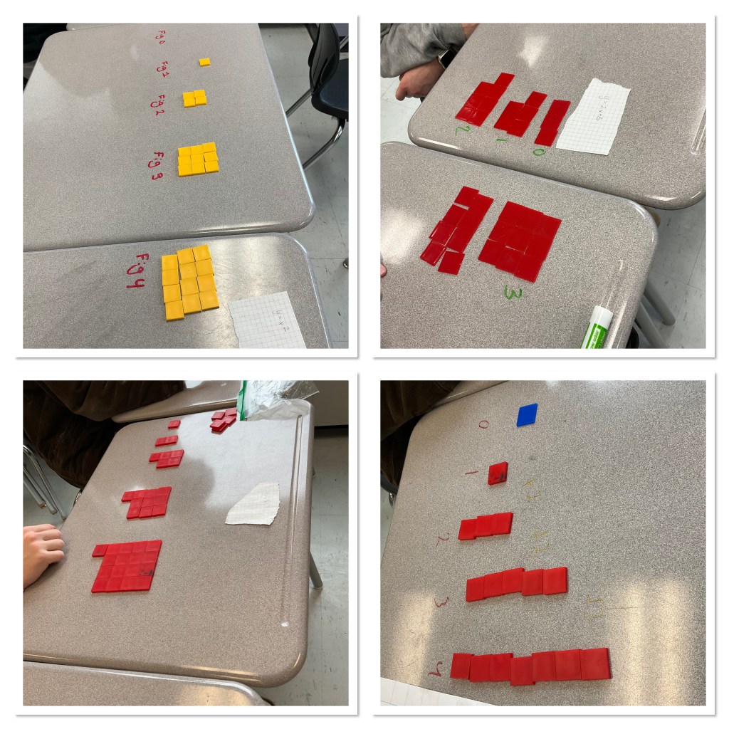 We started off today with each group getting a pattern rule (equation). They needed to use the 1 inch square tiles to build figure 0, figure 1, figure 2, figure 3, figure 4 of their pattern. Some needed to use 2 colours to represent positives and negatives.