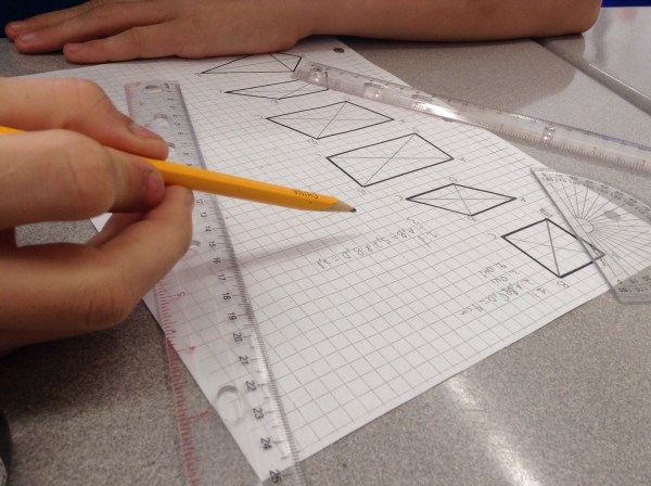 We’re exploring diagonals of quadrilaterals in grade 9 and 10 right now. In grade 9 we use rulers and protractors to see if the diagonals are rhe same length, bisect each other, and are perpendicular. In grade 10 we use coordinate points to do the same thing, calculating with the distance, midpoint and slope formulae.