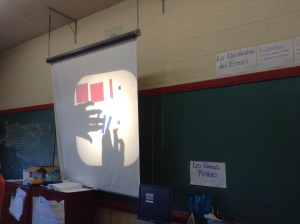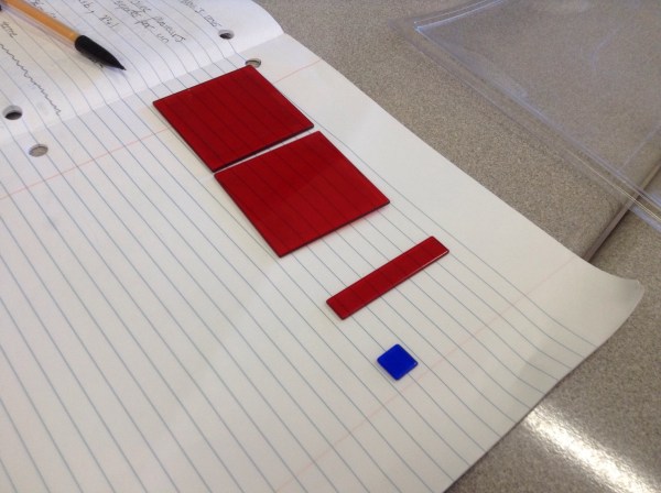 We’re using algetiles to represent polynomials in grade 9. Each of the different shaped tiles represents a type of number. The small squares are units (1), the rectangles are x and the big squares are x^2 (x squared). Red ones are positive, blue ones are negative.