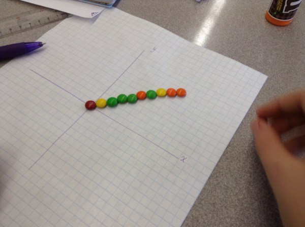 We are using candy to mark points on a plane that all have the same characteristics. This line shows when x=y. Here’s one where y is always 2, y=2.