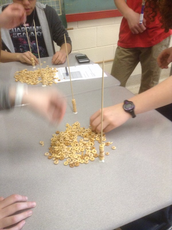 At the end of the class, the fastest and slowest members of each group raced. The group determined the head start (number of cheerios) to give the slower player so that they would have a tie at 20 seconds.