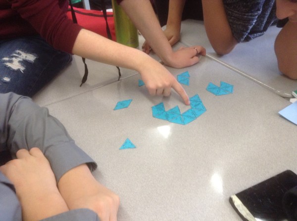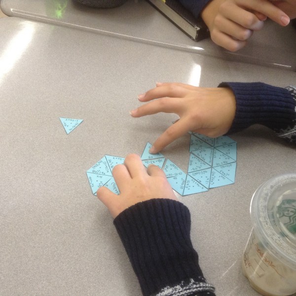 Another puzzle we did focuses on exponent laws and distributive property and combining like terms. Equilateral triangles with either a simplified or unsimplified wxpression on all or two sides are matched up so that equal expressions touch.