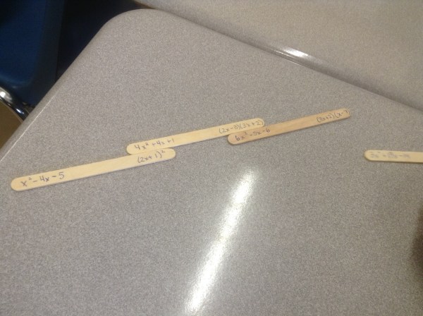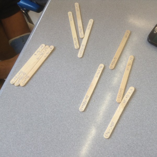 These sticks have a question on one end, and an answer on the other. Students need to match them up. We are practising expanding binomials, but other types of questions would work equally well.