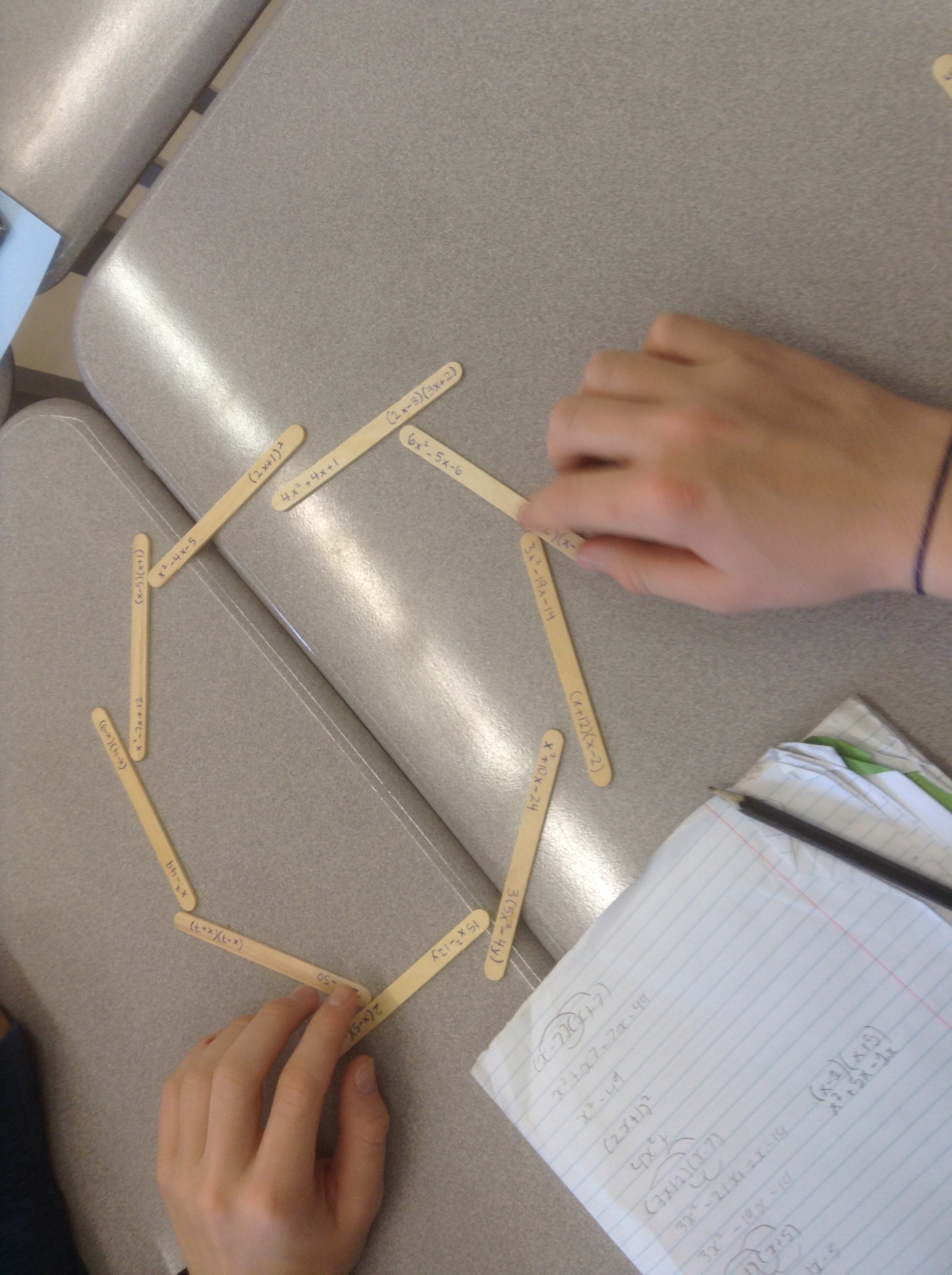These sticks have a question on one end, and an answer on the other. Students need to match them up. We are practising expanding binomials, but other types of questions would work equally well.