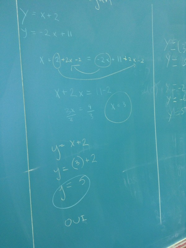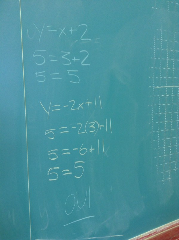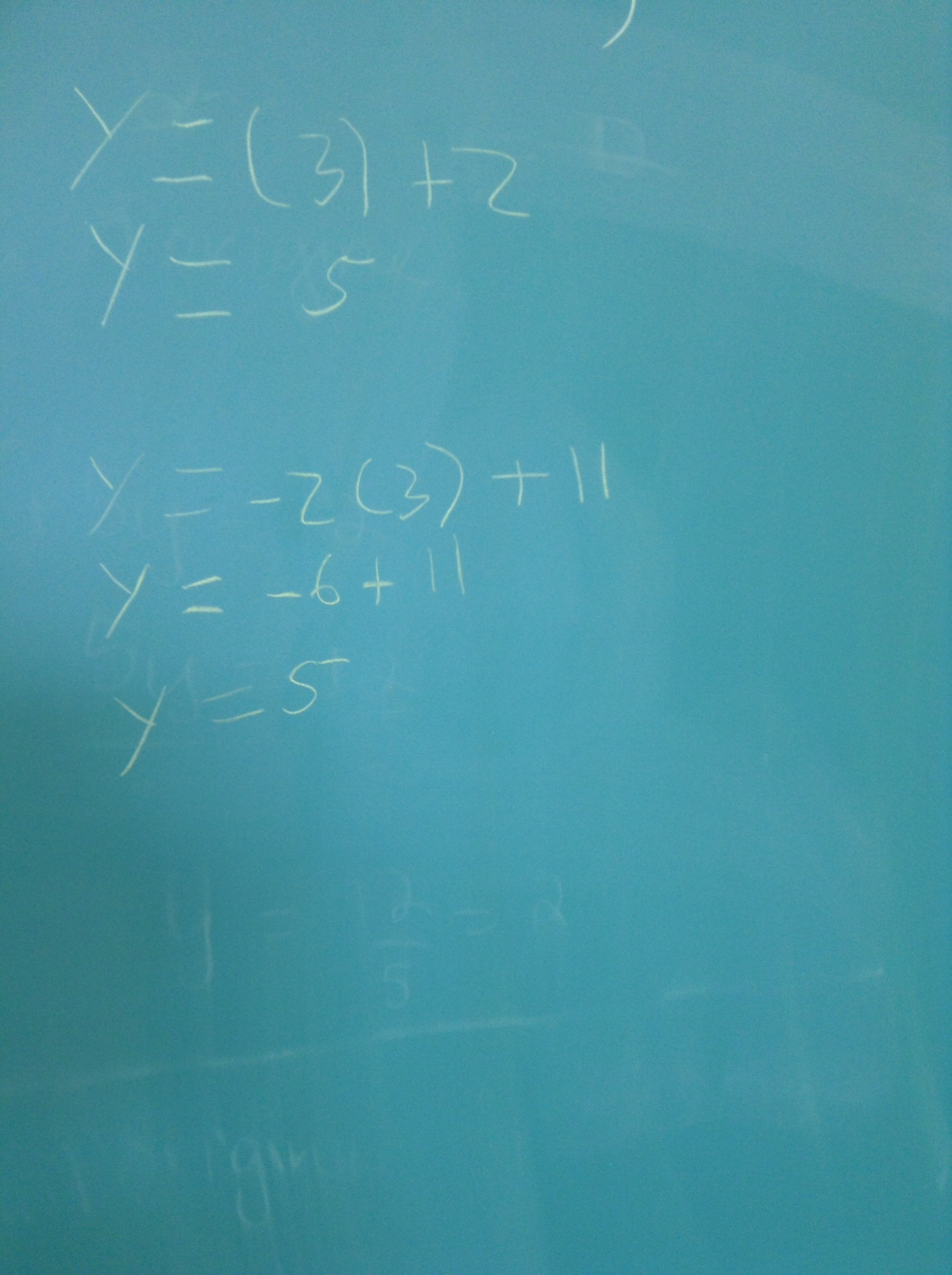 We were looking at how to prove a point (3,5) is the intersection of two given lines y=x+2 and y=-2x+11.