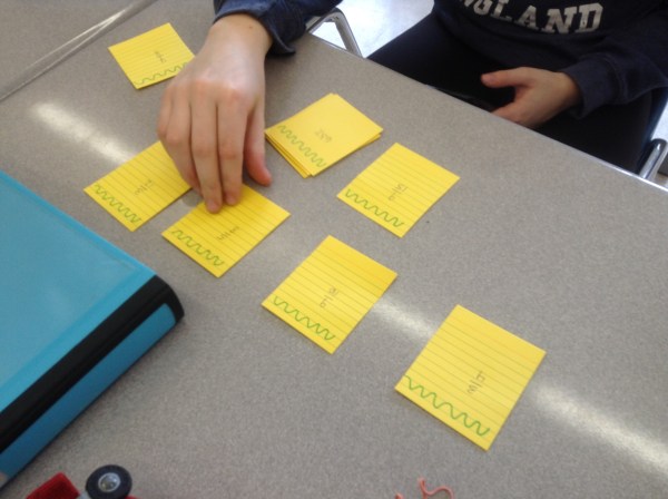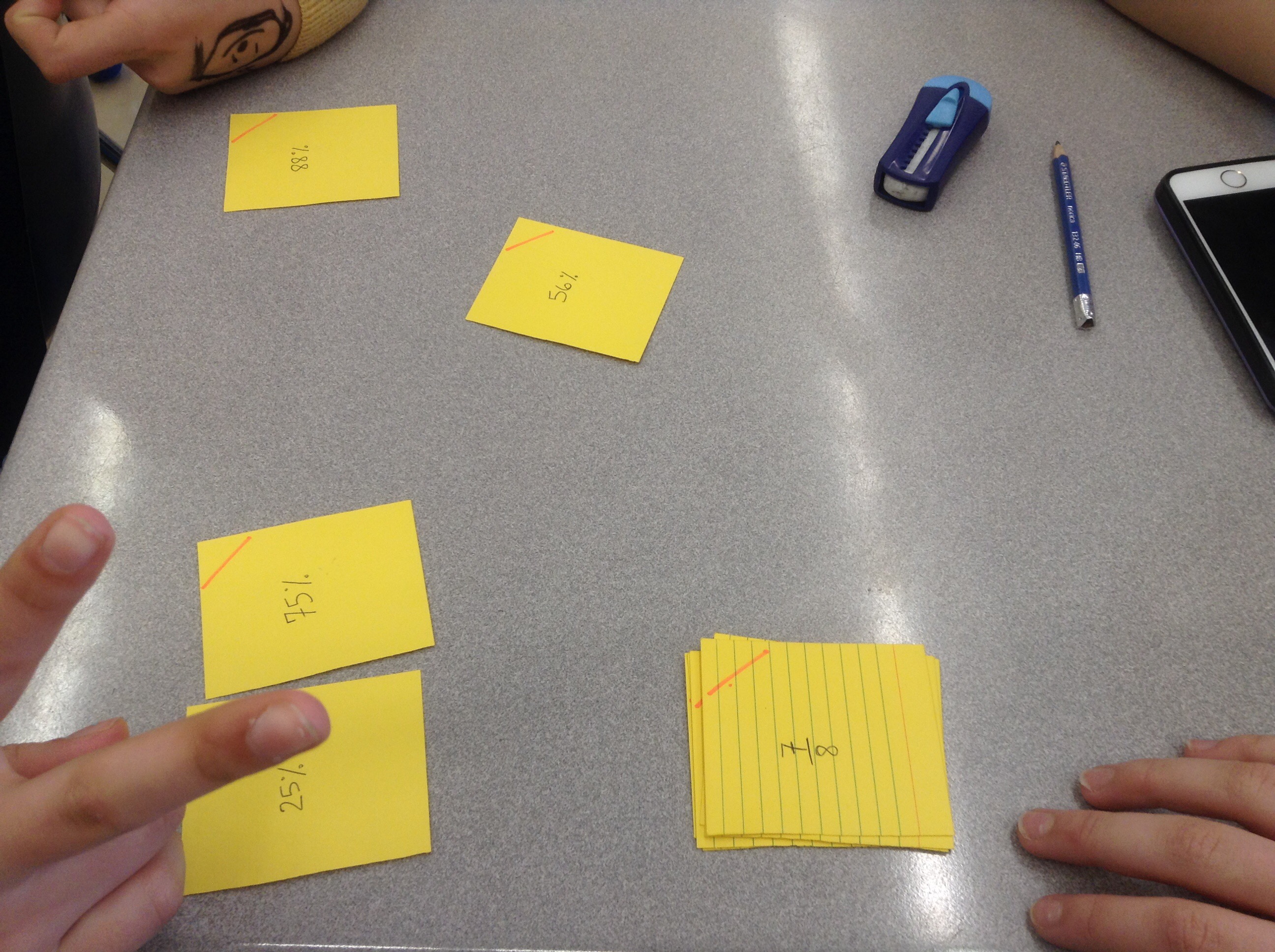 We are reviewing some of our math skills in preparation to run some activities with our grade 7 math buddies. This one is a stacking game where fractions and percents are matched up.
