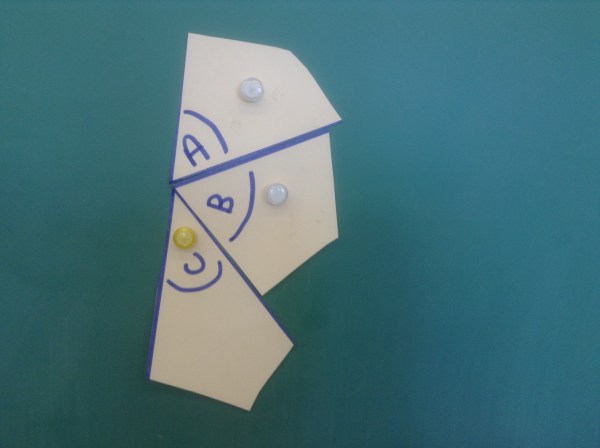 Here’s a triangle. A B and C are internal angles. D E and F are external angles. Here is a nice visual proof of some of the theory we’re working on.