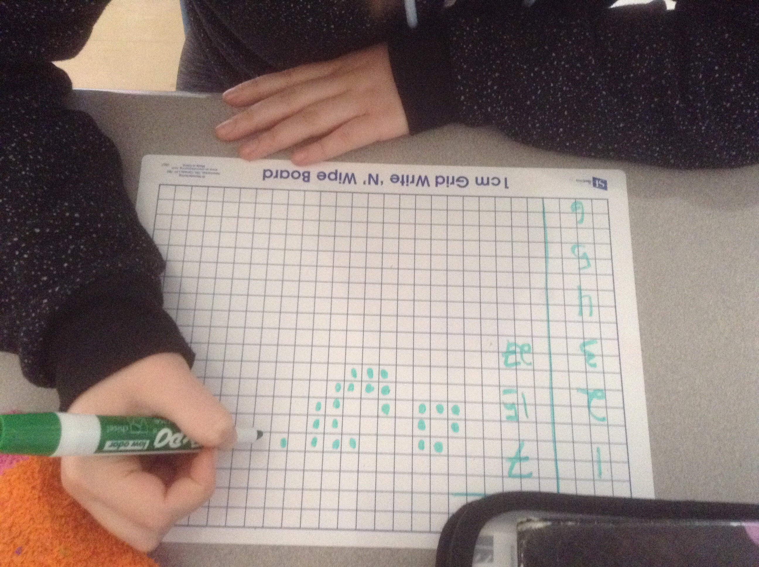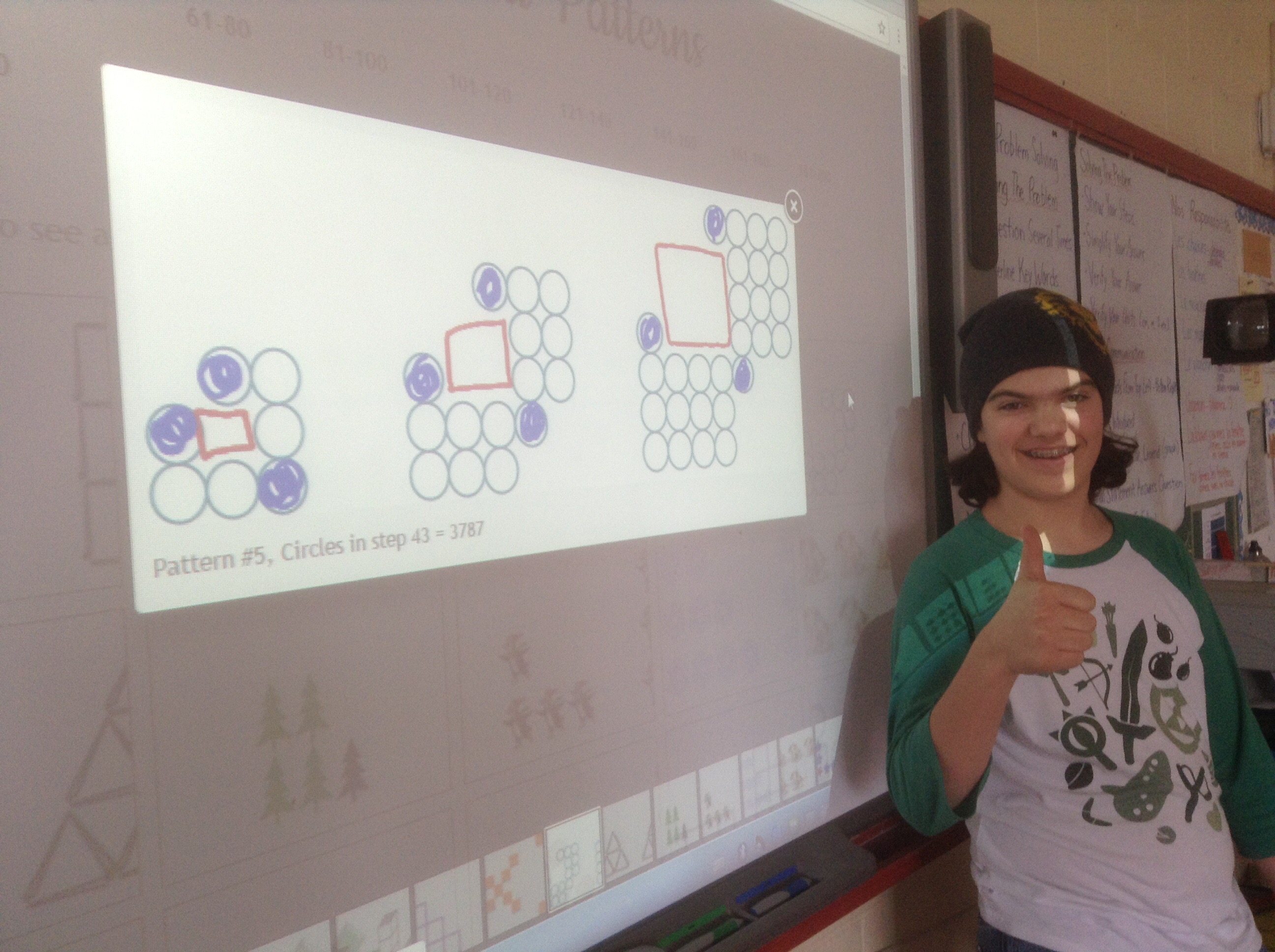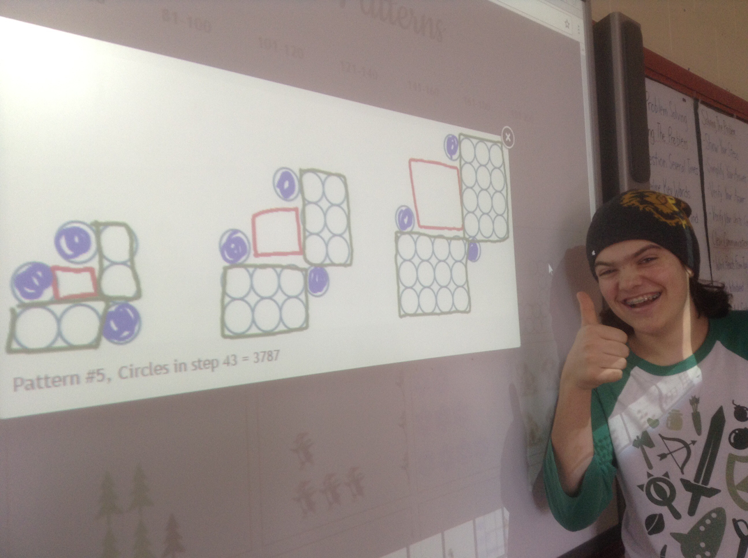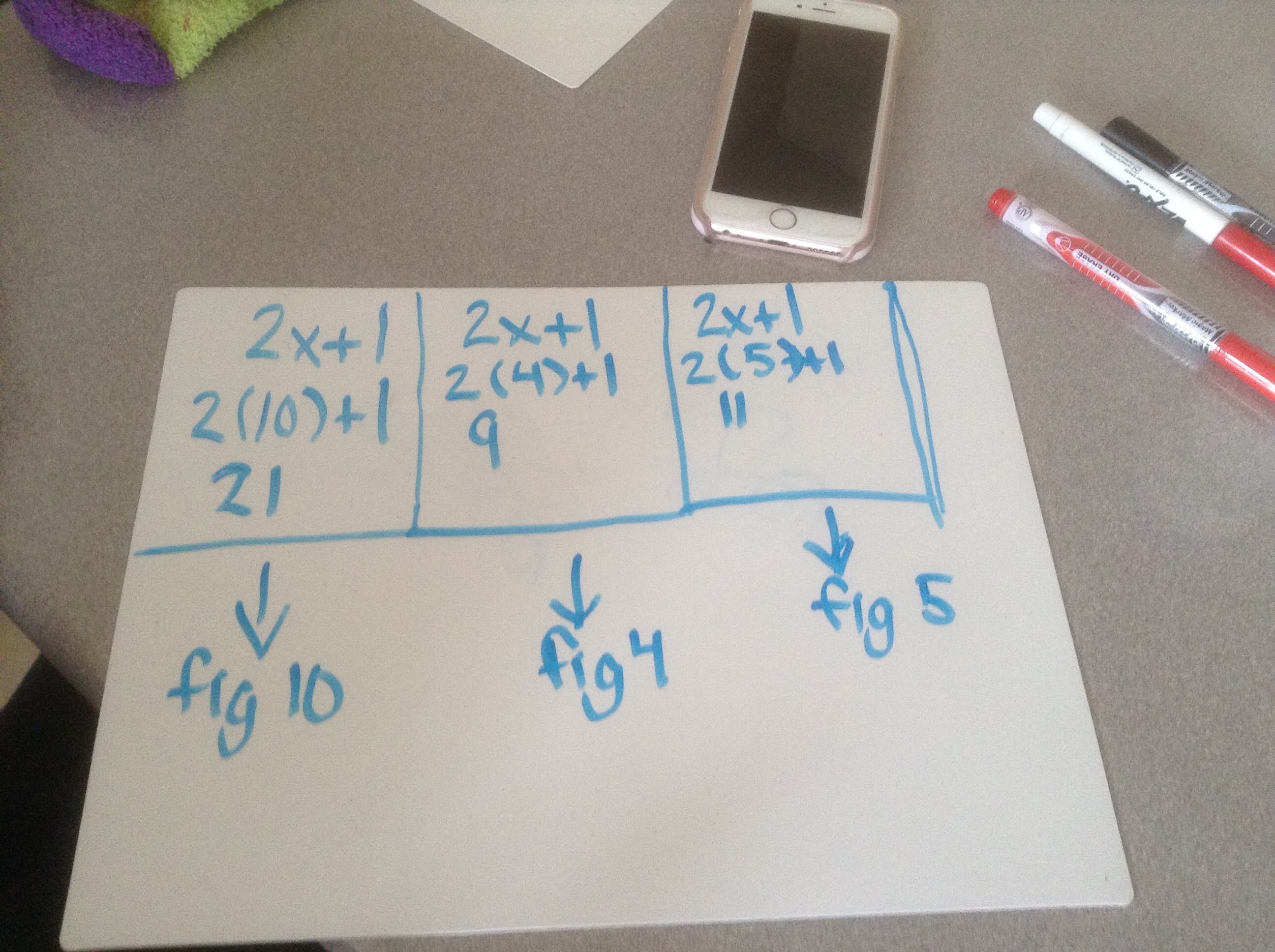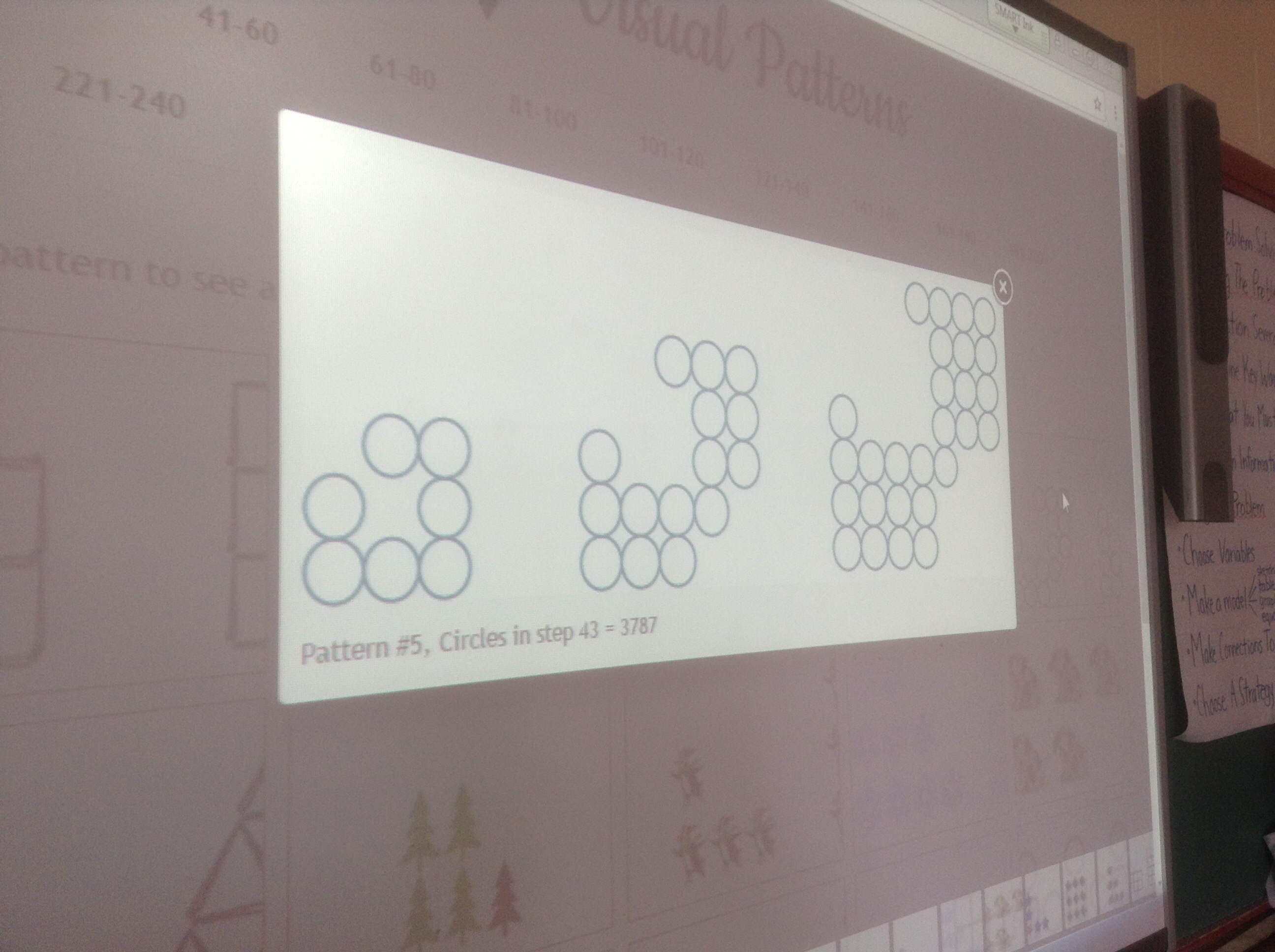 We explored some of the patterns at Visualpatterns.org and worked on extending the 3 terms by creating term 4,5 and jumping to fimd term 10. We also worked backwards to term 0. We made pictures and tables and graphs to determine if the growth patterns were linear or non linear. Some of us worked on making equations for the growth we see in the patterns.