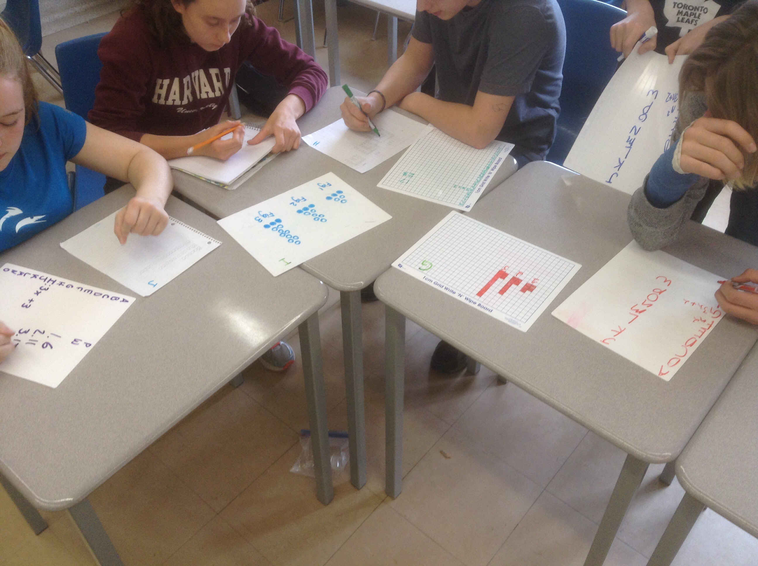 We set up the room with a pattern per desk, and then we rotated around the stations determining the pattern rule: what the change is between figures, what stays the same each time, what figure 4 would be, what figure 0 would be, and whether it is linear or not.