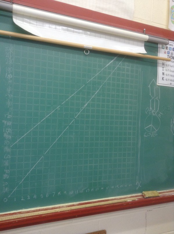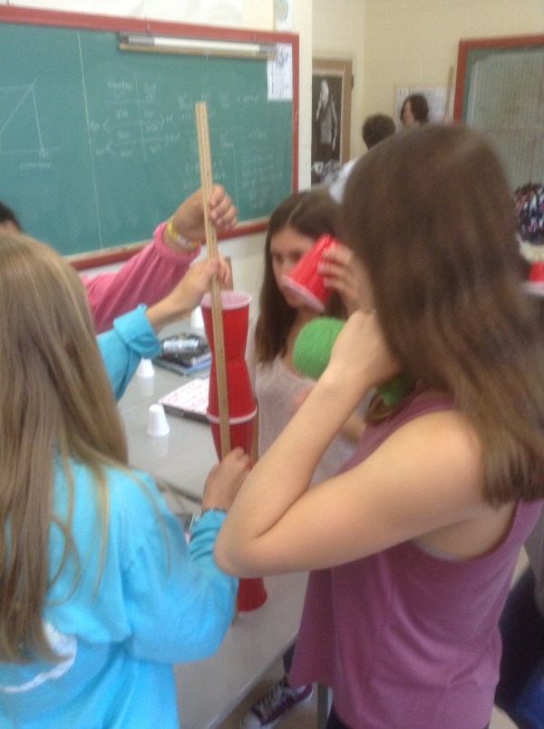 We finally worked on the big intense challenge: if white cups stack from the desk, and red cups stack from the floor, is there a magic number of cups that would create equal towers?