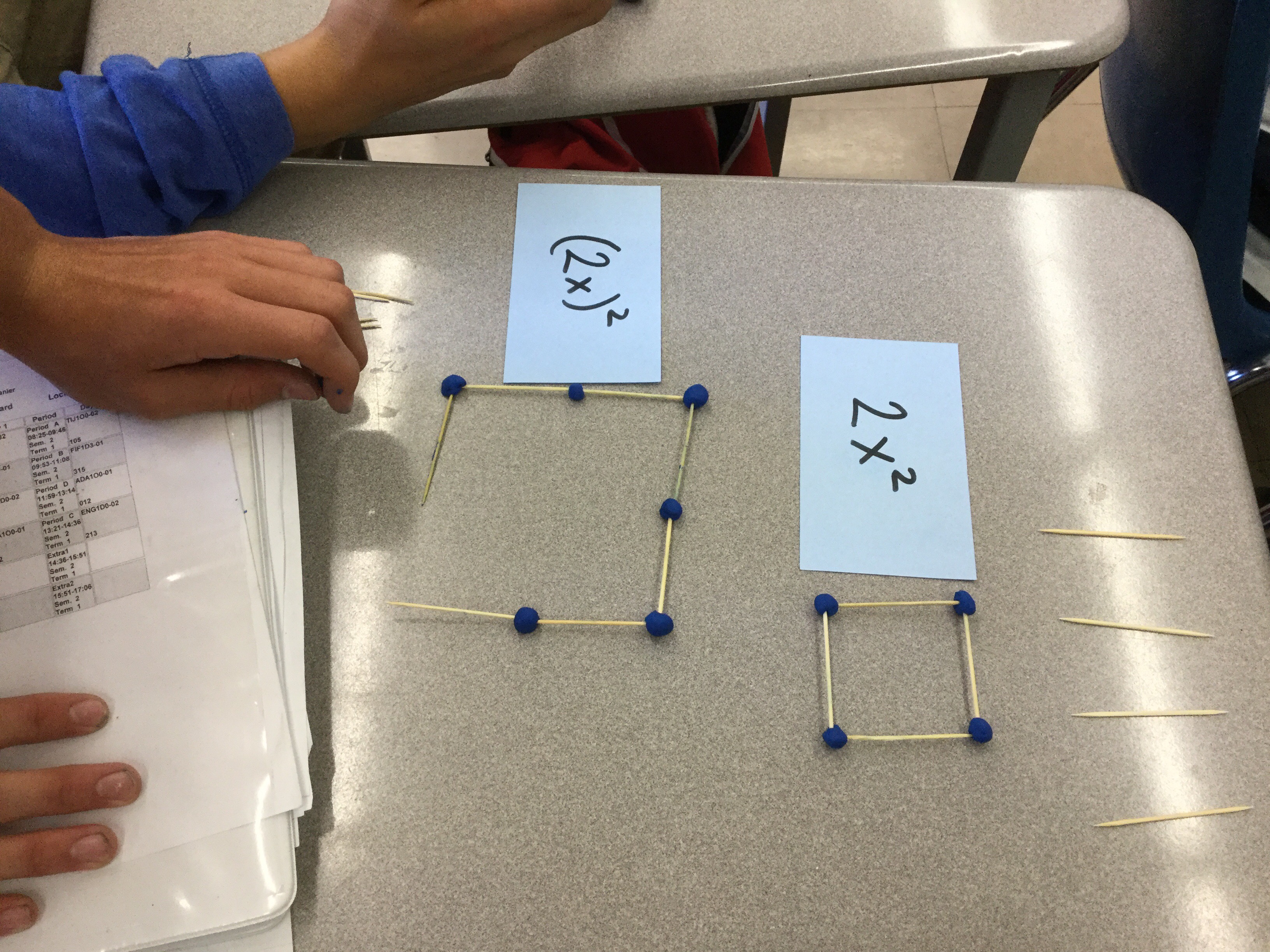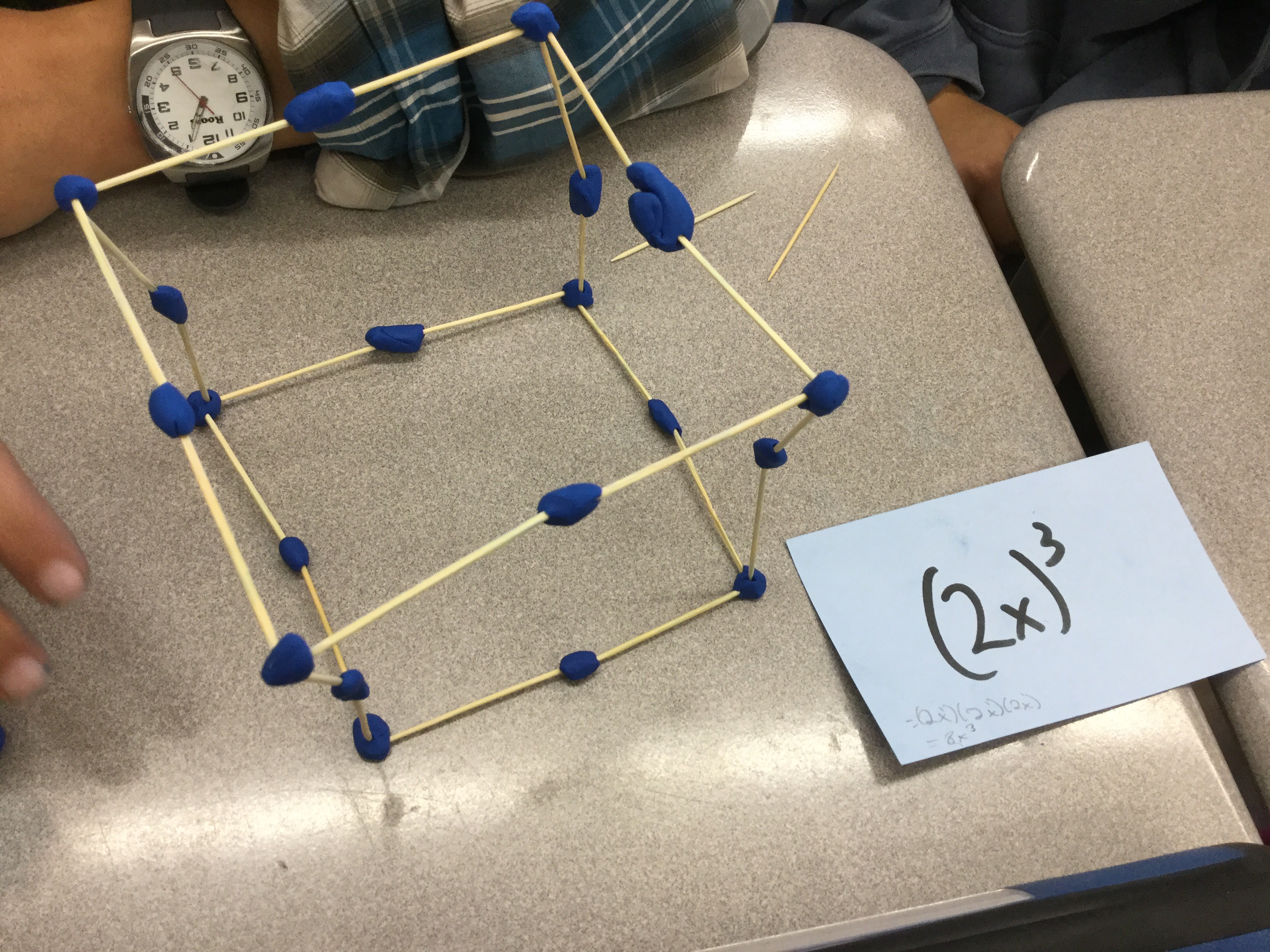 We noticed that within this big cube, with side length 2x, we can fit 8 little cubes with side length x. We can expand the expression (2x)^3 to be (2x)(2x)(2x) which is 8x^3.