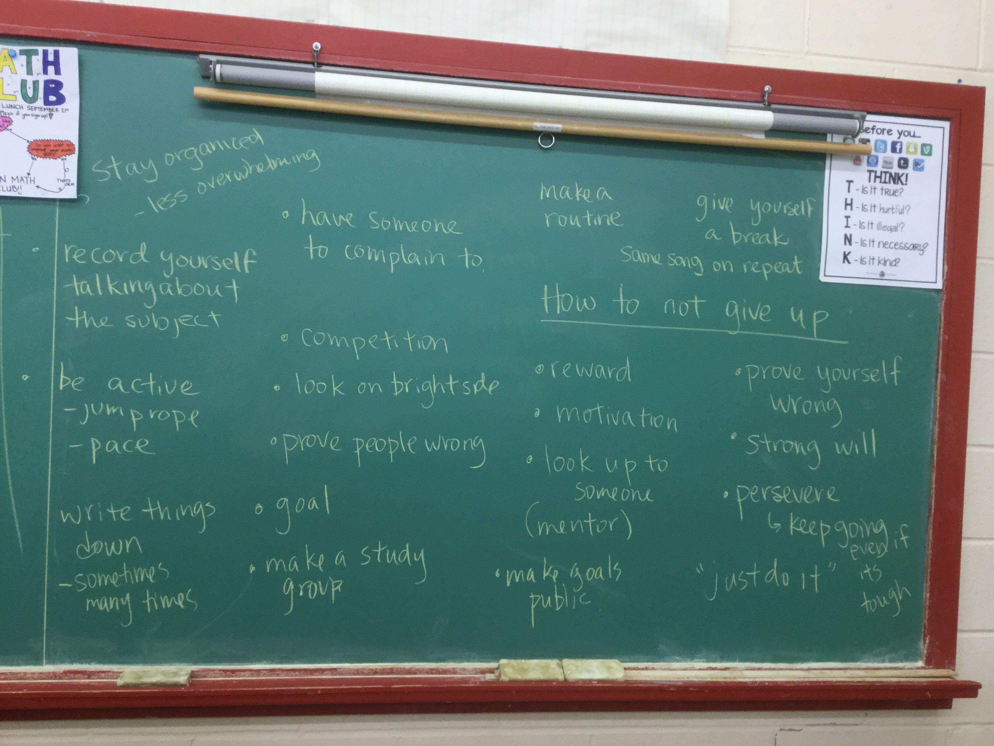 We took a break from the math, and looked at all the strategies we could brainstorm to keep going, and get motivation….we looked at changing our thoughts, to setting small goals, to asking for help, and changing up approaches. Here’s our list.