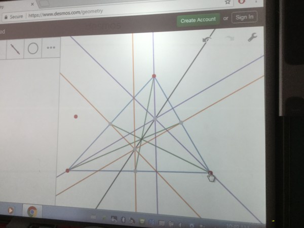 Desmos has a beta version of dynamic geometry software. We used it today to construct medians, perpendicular bisectors, altitudes and see how they intersect. It’s pretty neat that all of these intersections are always colinear.