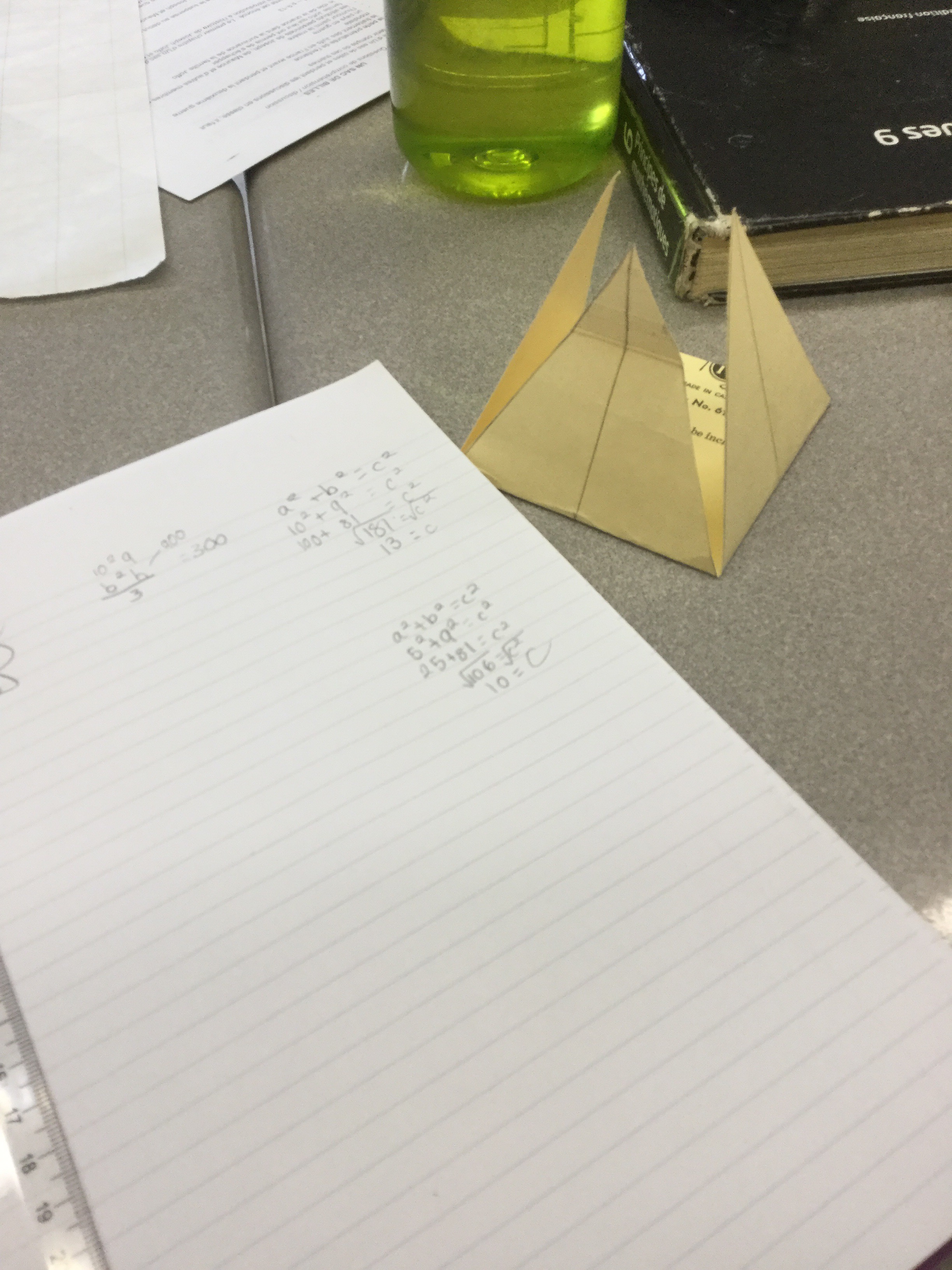Today’s task was to make a pyramid with a volume of 300 cubic centimetres. What was interesting was each group independently decided to use dimensions of the base as 10cmby 10cm and the height 9cm.
