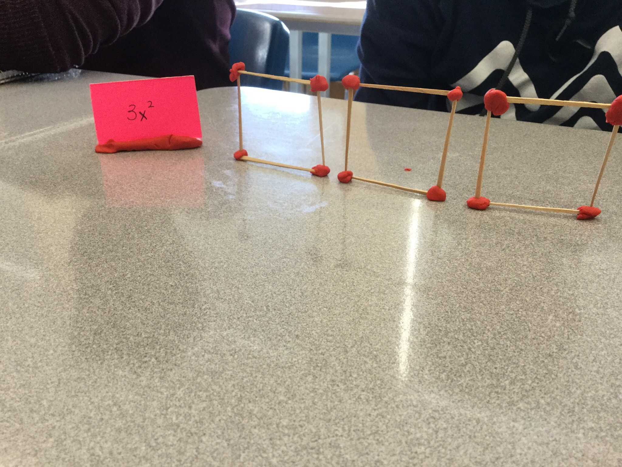 Today we looked at representing exponents in a visual way. We used a toothpick to represent x, and we built x squared by making a square with side length x.