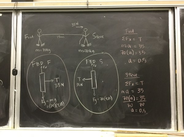 We had an interesting problem today (3.5 #3). It involved two inline skaters holding on to a rope. One skater pulled the rope, hand over hand. We were given the force that they pulled with, and the distance they were separated, and the mass of each skater, and had to figure out the time it would take them to meet.