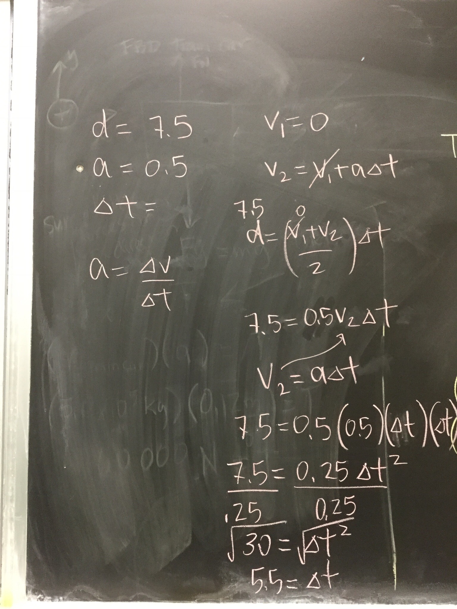 Here’s the math that we did to show how we figured out the time it would take. We needed our kinematice equations from last unit to help us out.