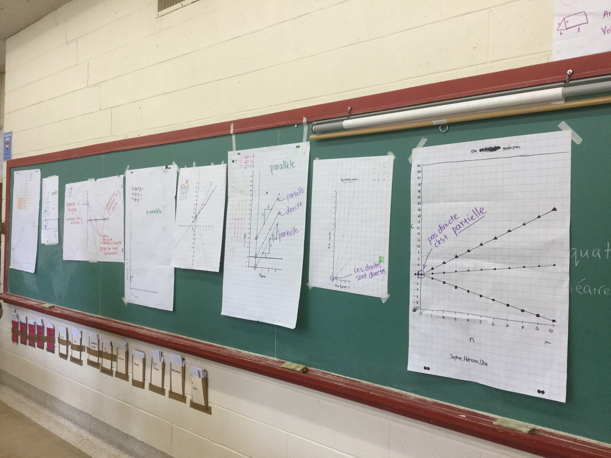 We learned that direct relations go through (0,0) and partial ones do not go through (0,0). We learned the names for the x intercept (abscisse à l’origine) and y intercept (ordonnée à l’origine), we looked at the rate of change (taux de variation) and also introduced the word slope (pente). We noticed that the rate of change /slope is given by the coefficient in the equation and the y intercept is the same as the constant (initial value). If the lines are parallel, they have the same slope.