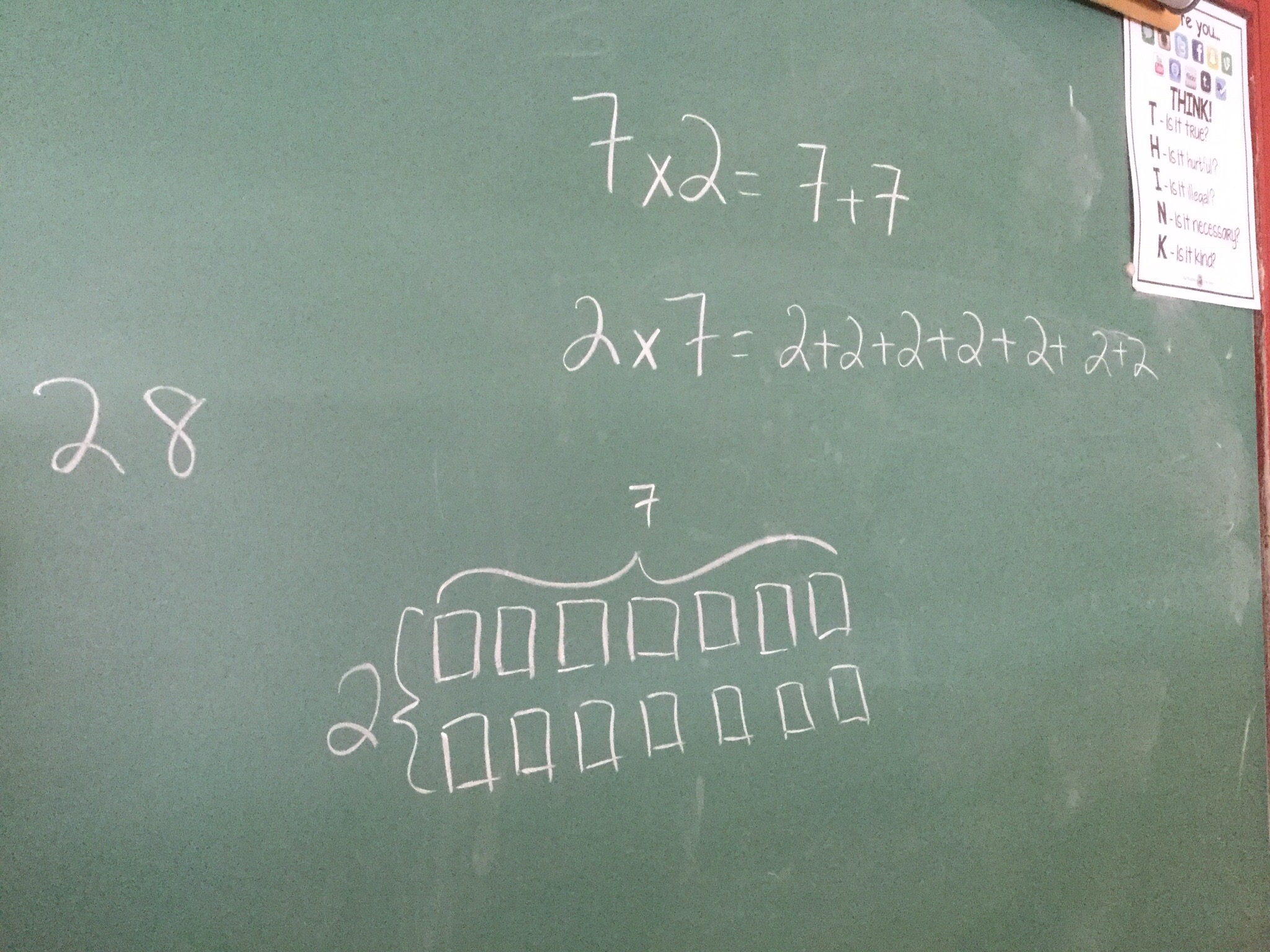 We have 100 mixed multiplication questions from 2-12. We collected initial data yesterday, and then talked about some useful strategies or ways to represent multiplication. We talked about how multiplying is repeated addition, or how it can be shown as an array, or a rectangle.