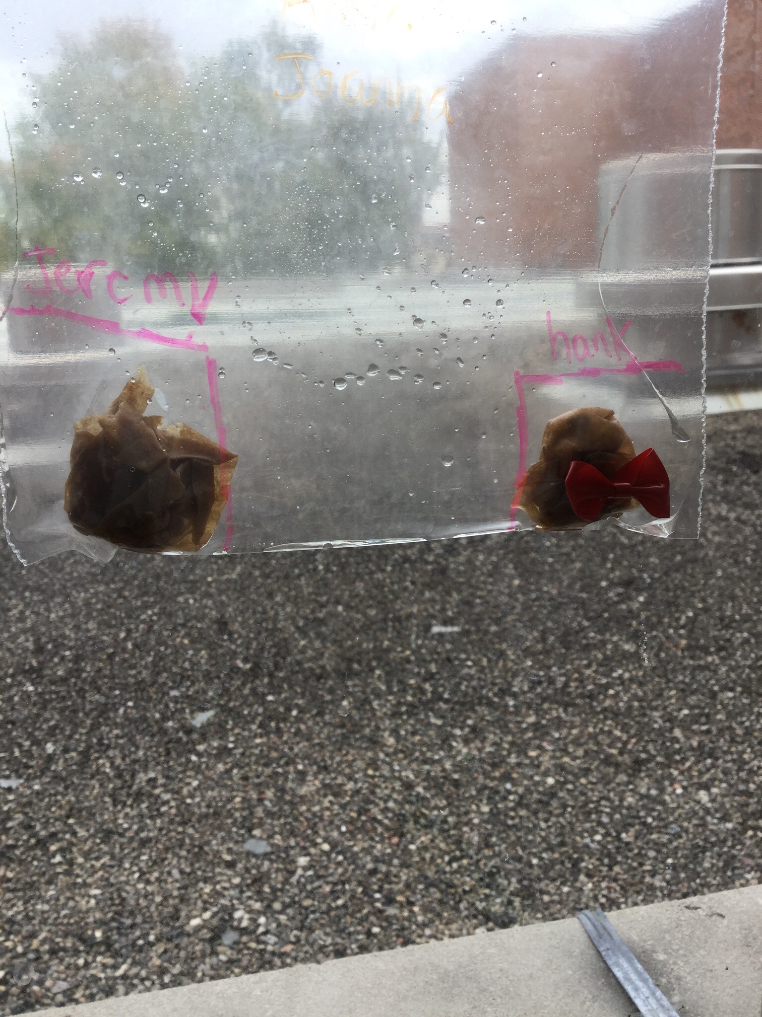 Some groups are being the “control” and leaving them on the window ledge. Others have added extra to their experiment. We have groups depriving their beans of light (their baggies are in a drawer). We also have groups experimenting with giving love to their beans….they love Jeremy but not Hank. We’ll see what happens there!
