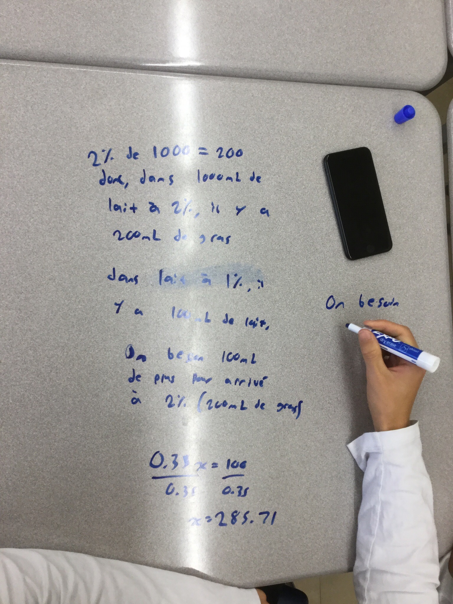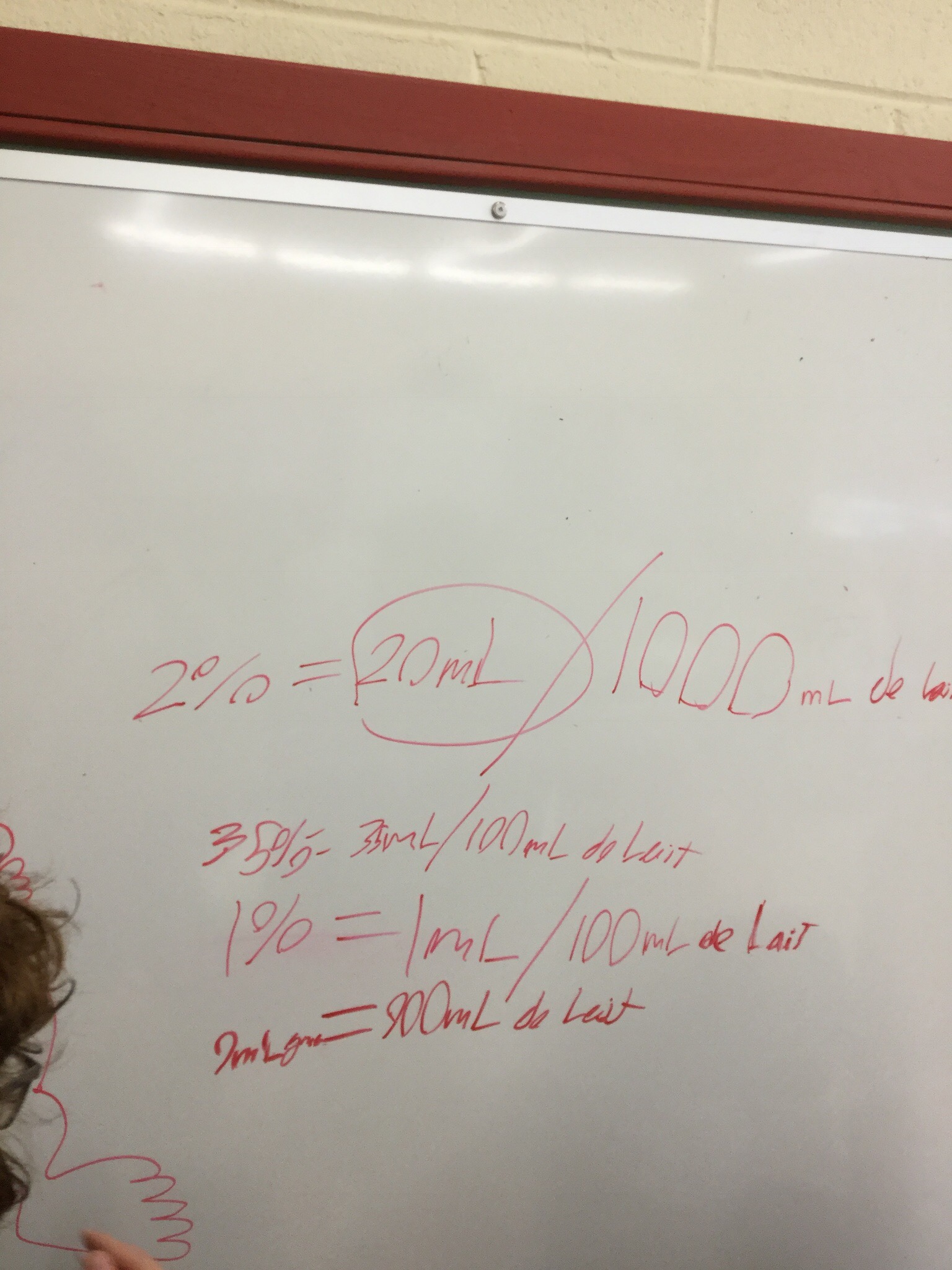 Today in grade 10 the problem was all about milk and cream. Imagine you needed 1000mL of 2% milk for a recipe, and you didn’t have any. You do have 2L of 1% milk and a carton of whipping cream (35%). Can you possibly create 2% milk?