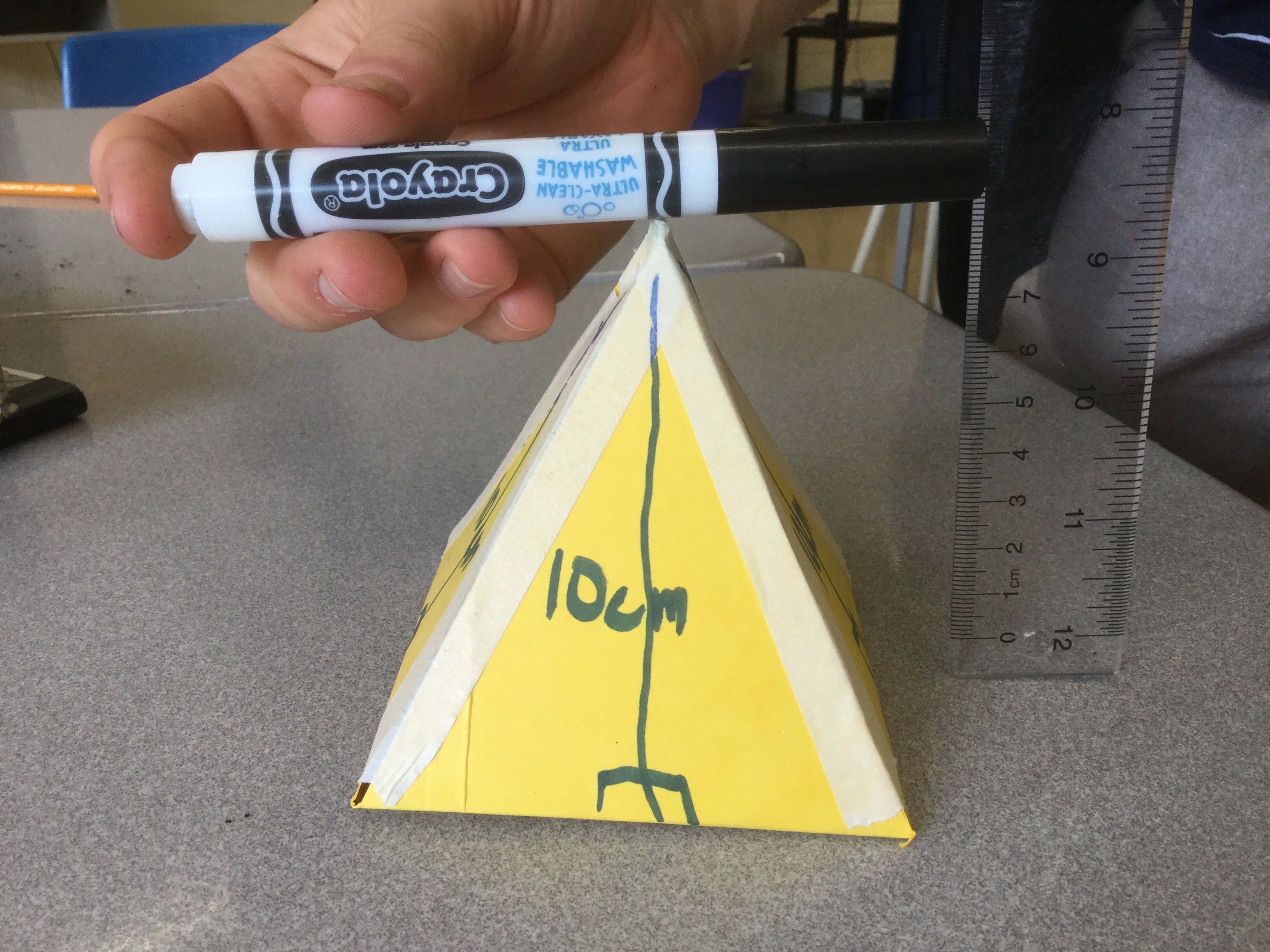 We need to use the pythagorean theorem when we design pyramids like this. We had figure out what height we wanted the pyramid to be overall, but that is not the same as the height of each individual triangle that makes up the side of the pyramid.