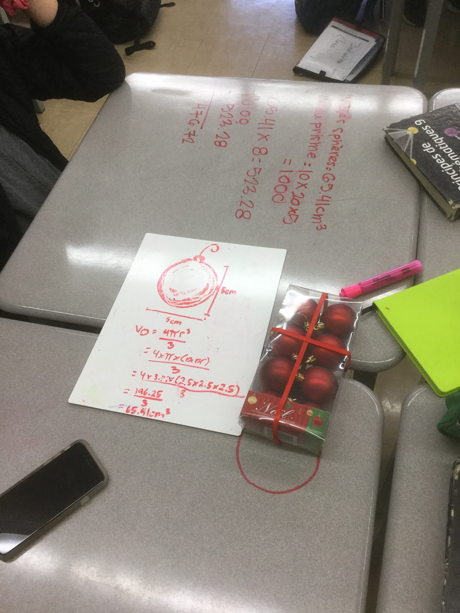 Given minimal information (one side length of the prism) we determined the other dimensions of the prism, and the spheres. We practiced our volume calculations that we derived yesterday, and we subtracted to find the empty space.