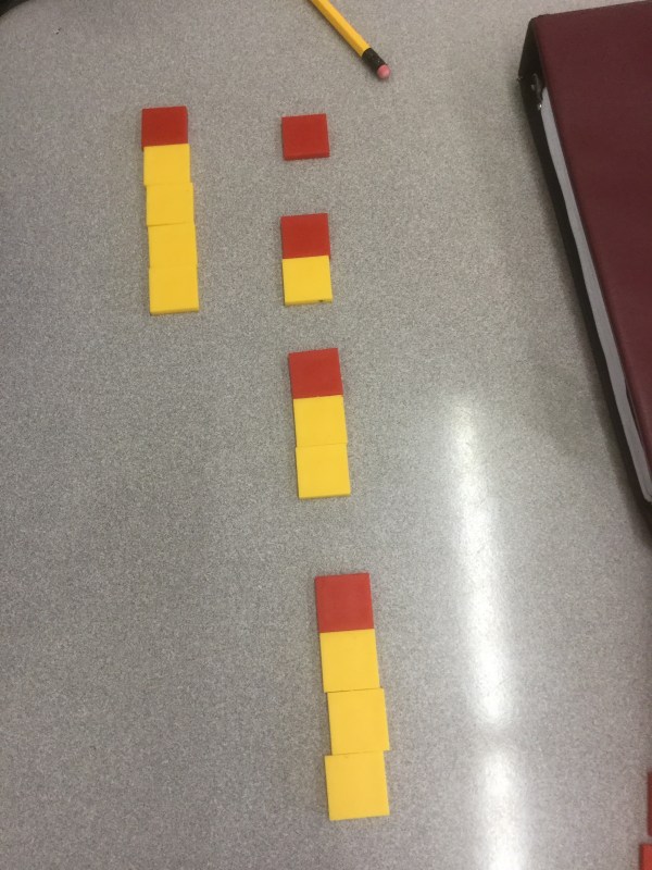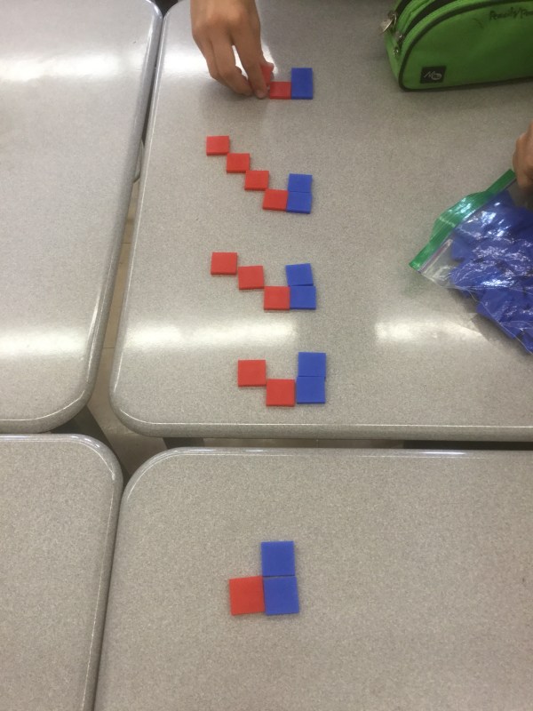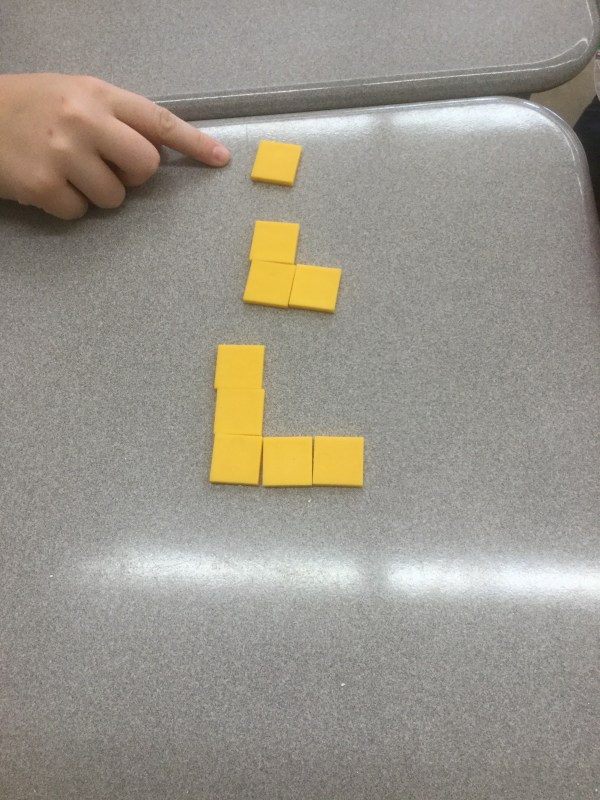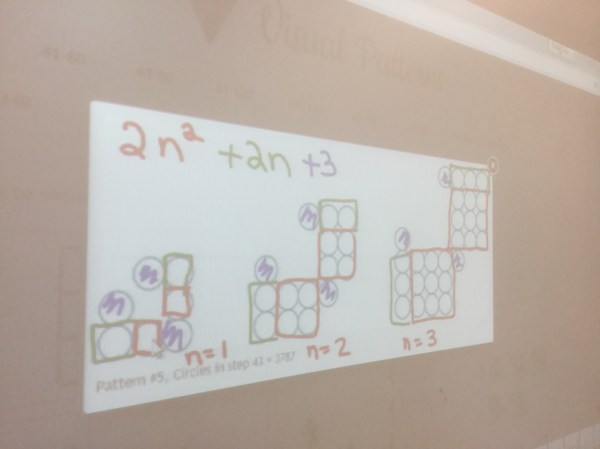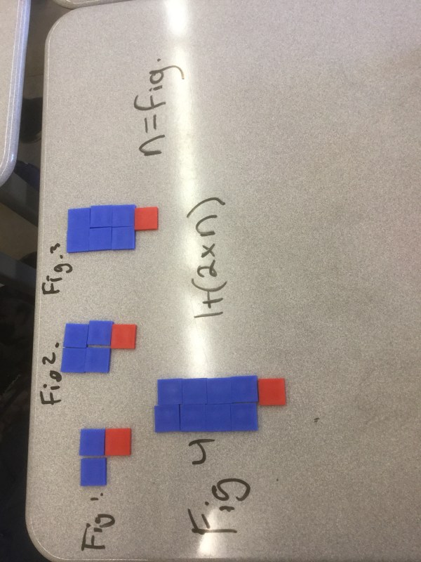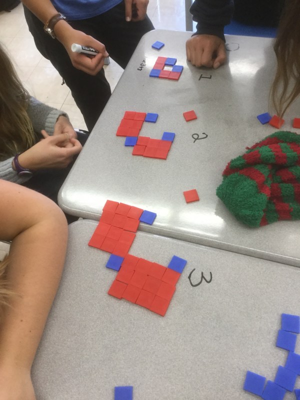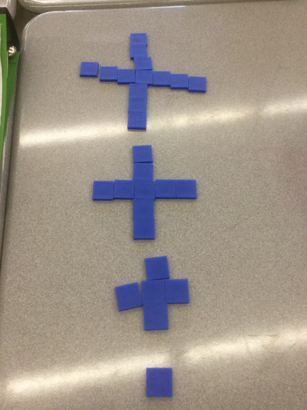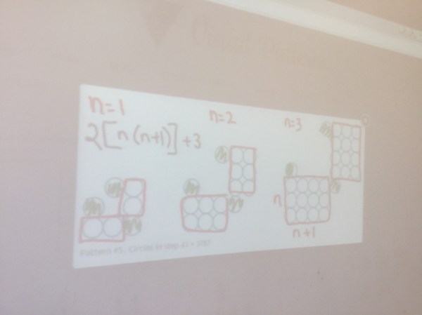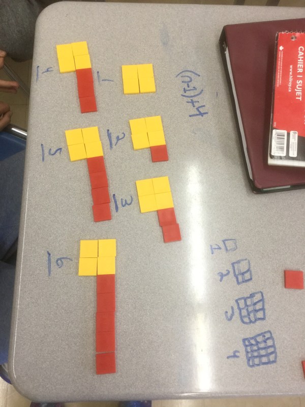 We are identifying constants (here in red) that never change. We are also looking for groups of “n” (eg in figure 3 we are looking for groups of 3). Sometimes we extended the pattern to show figure 0 and figure 4