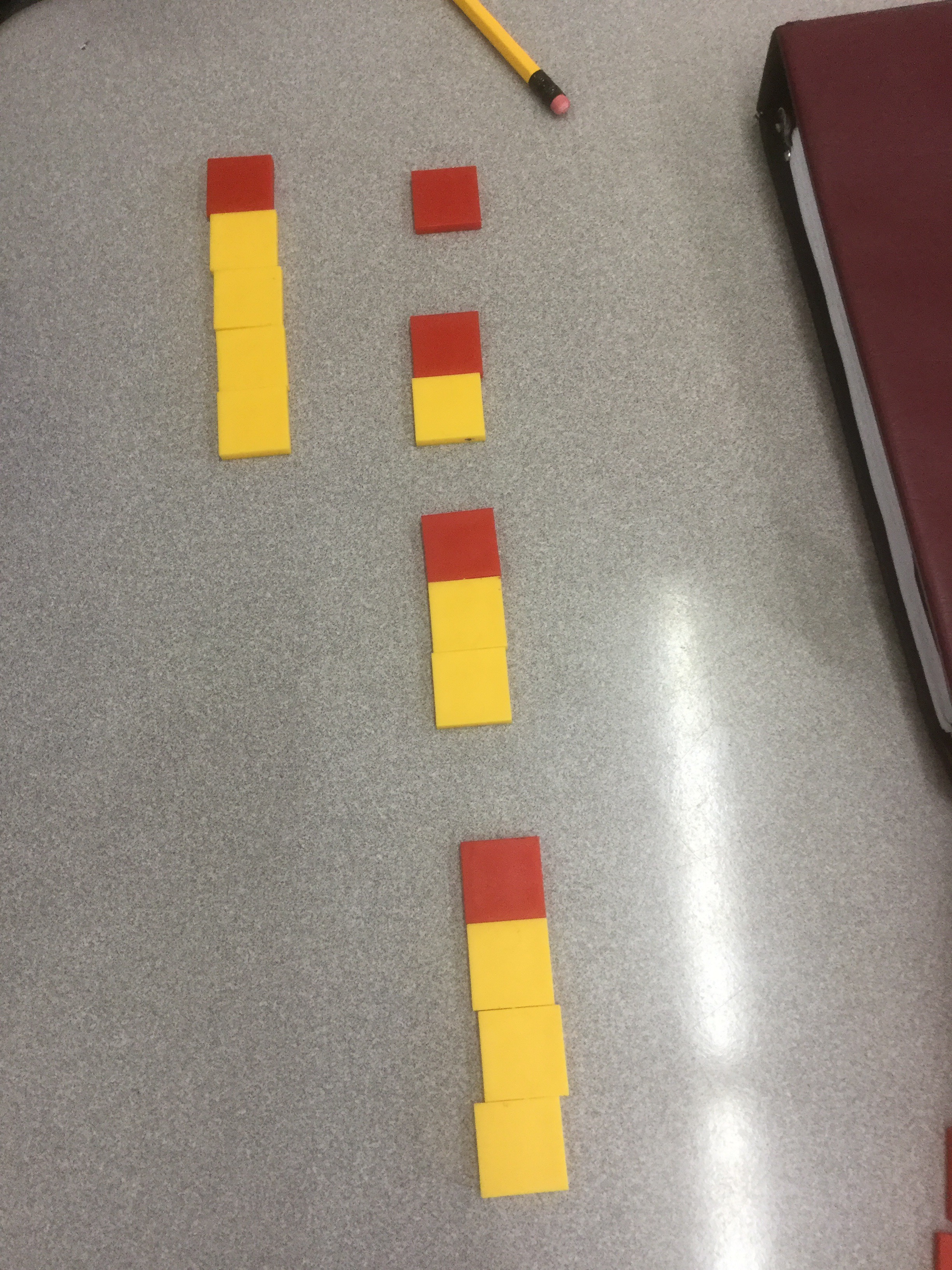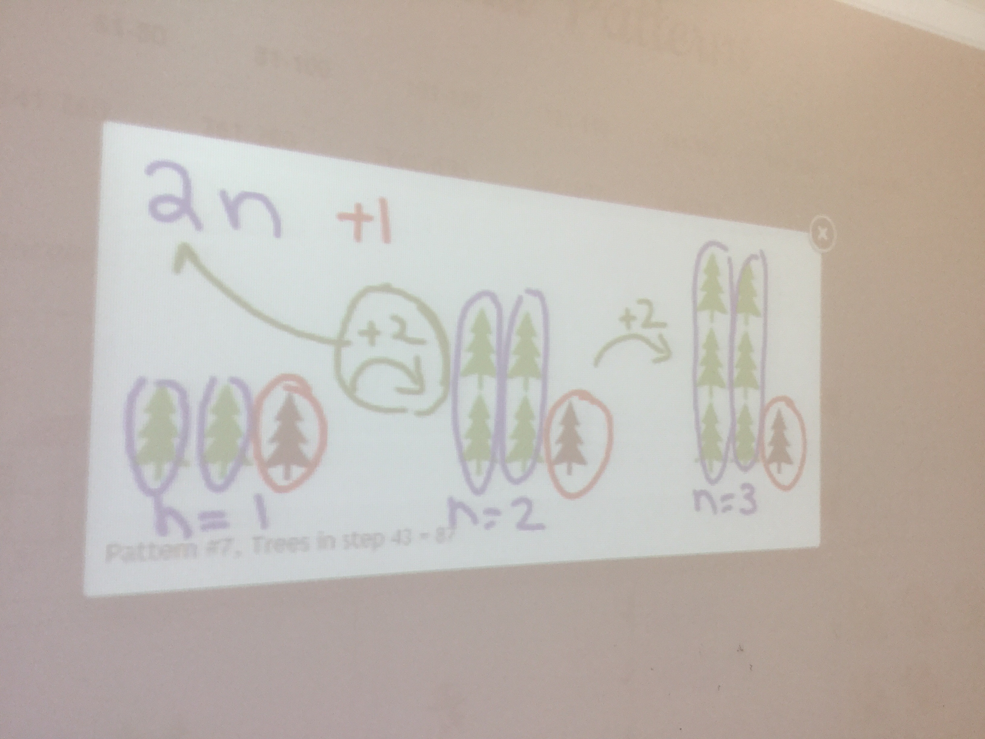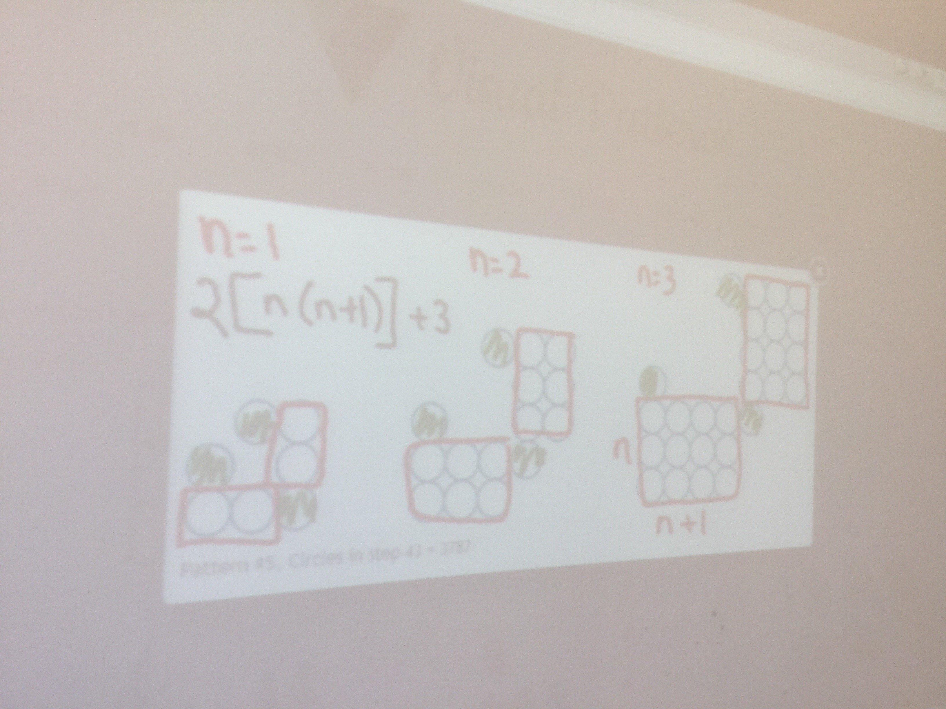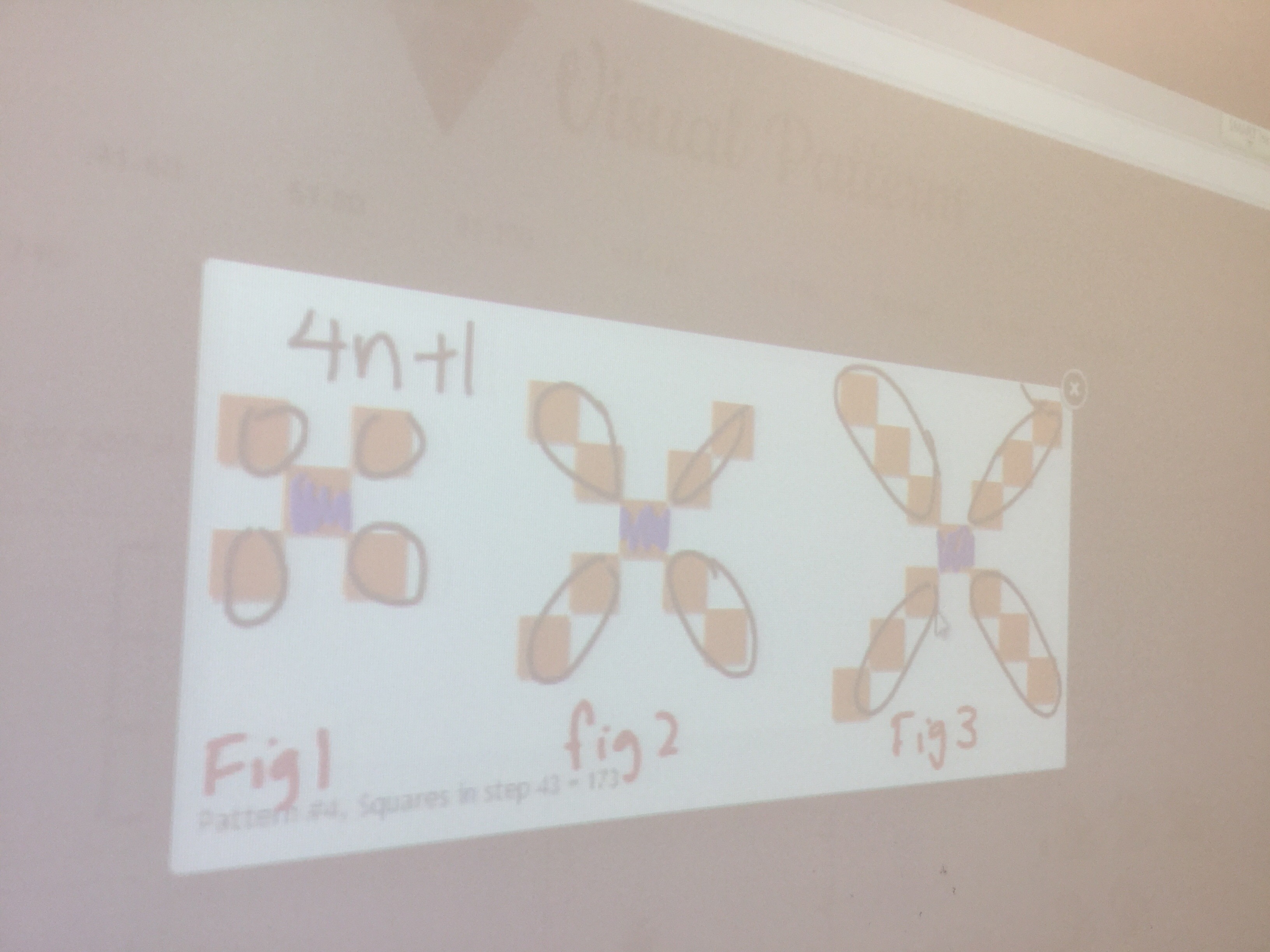 We are identifying constants (here in red) that never change. We are also looking for groups of “n” (eg in figure 3 we are looking for groups of 3). Sometimes we extended the pattern to show figure 0 and figure 4