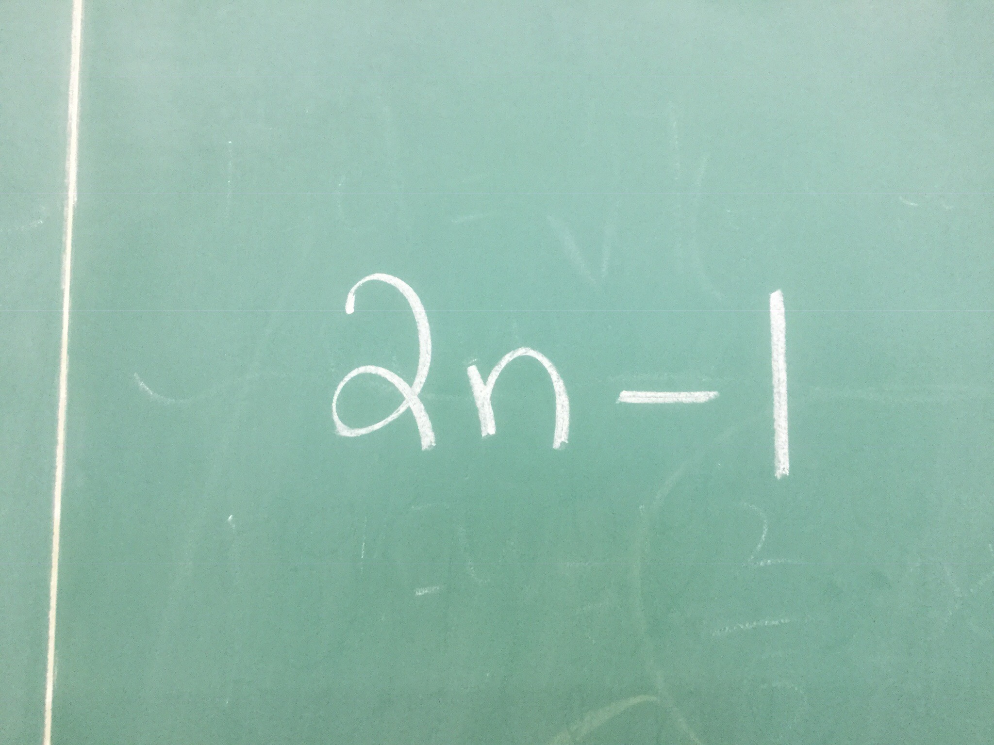 Here’s an example of 2n+1. We see the 1 is a constant term, always there (the yellow square). We are looking for groups of n when we look at the blue. See them? Horizontally we have 2 groups of n (when n is 1 we have 2 rows of 1, when n is 3 we have 2 rows of 3). We are using n to represent the figure number.