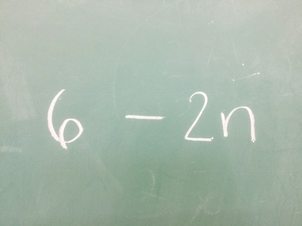 Our expression is 6-2n. We know that the constant is the number that isn’t beside the n. It is not dependent on n. It does not change…it is CONSTANT. In this image blue is representing positive, red represents negative and a sandwich of red on top of blue is equivalent to zero. We start with a constant of 6 blue tiles. And each figure number will have 2 groups of n that are negative (red) placed on the existing blue tiles. Figure 1 then is equivalent to 4, figure 2 is equivalent to 2 and figure 3 is 0 and figure 4 is negative 2.