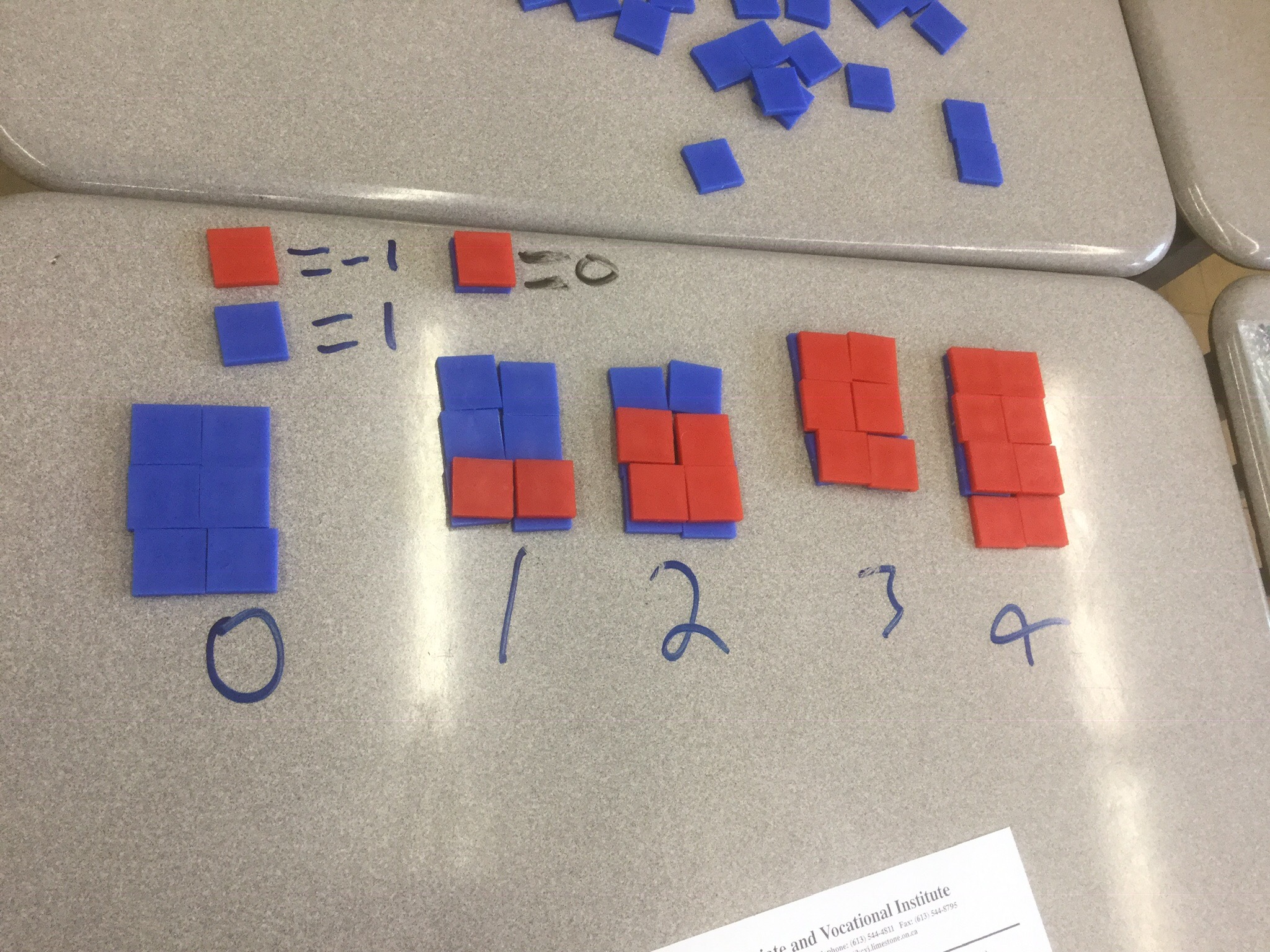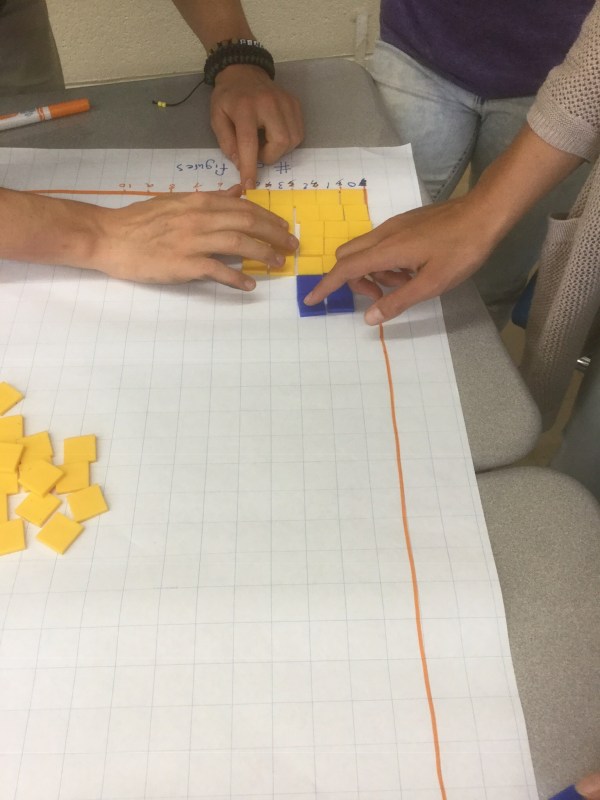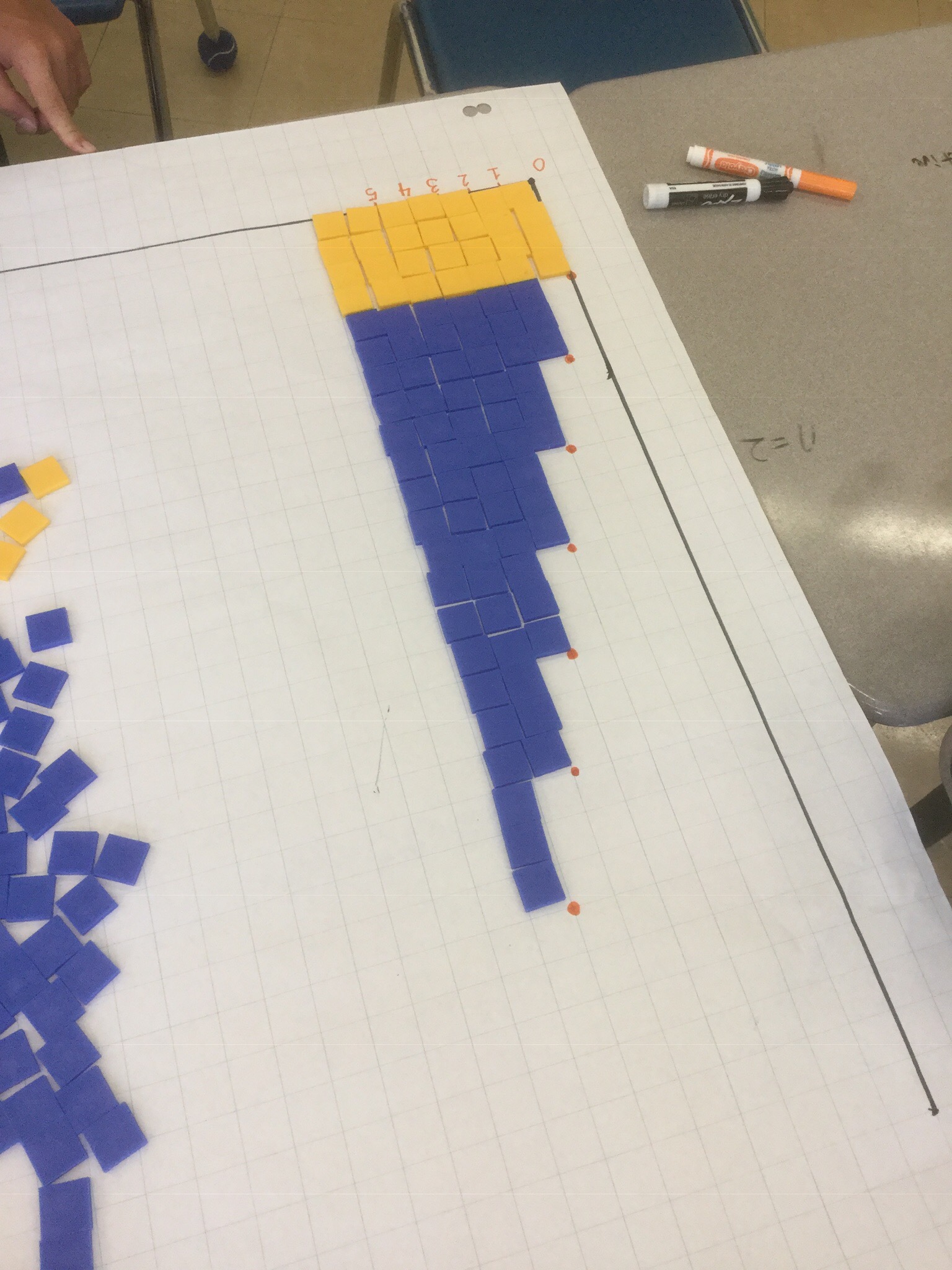 Each group was given 2 different expressions to build on their graph. We used the big chart paper because our tiles are the same as the squares. We lined up all the tiles from each figure vertically, and put a dot with marker on the top left corner of each column.