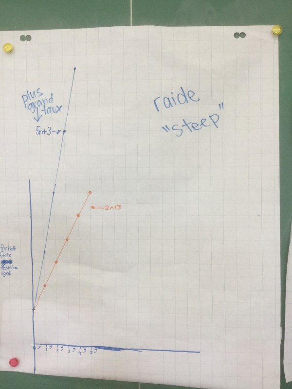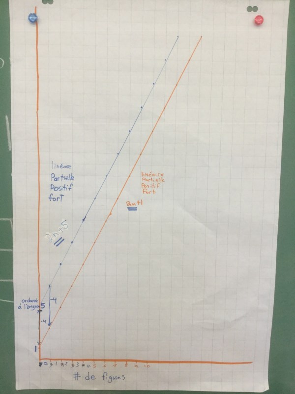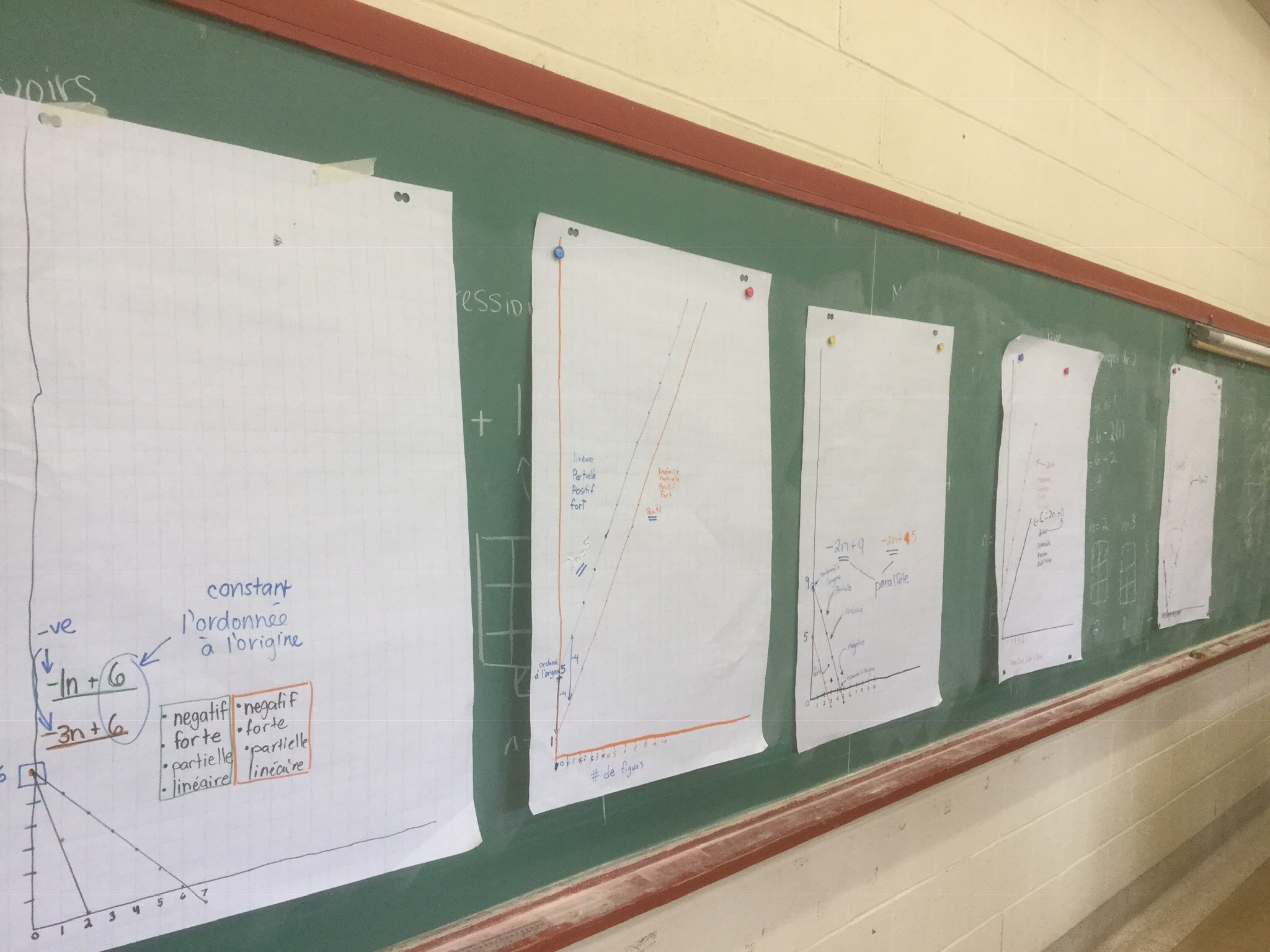 We posted all of our work up to admire and examine. We are really good at naming the trends we see in the graphs. We continued to use our new word “ordonnée à l’origine” (y intercept) and we connected that to the constant in the expression and the pattern. That is the same as figure zero.
