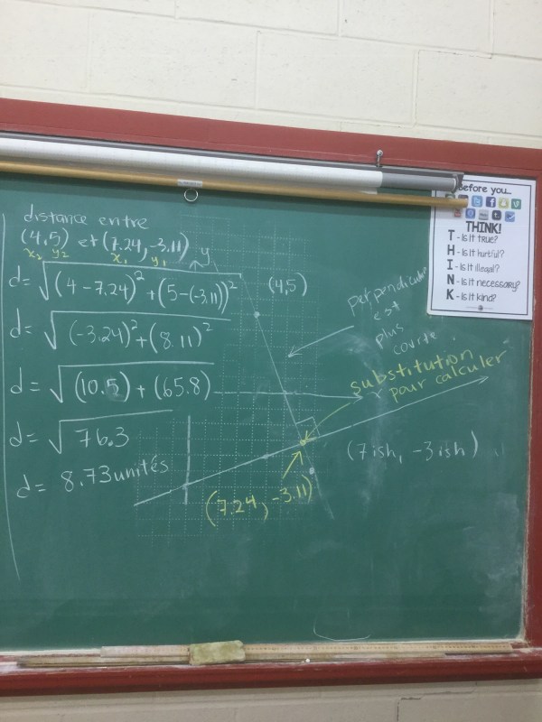 Grade 10s experienced some productive struggle today as we attempted to determine the shortest distance between a point (4,5) and a line (y=2/5x-6). Many could guess approximately where the shortest distance would be…. and a few lightbulb moments happened when we realized it would be perpendicular to the line….and we know perpendicular lines have slopes that are negative reciprocals (inverse négative)…so we made an equation for the perpendicular line….and then we needed to solve for the intersection of the original line, and the new line. We substituted, and solved….and then….and only then….could we use the distance formula.