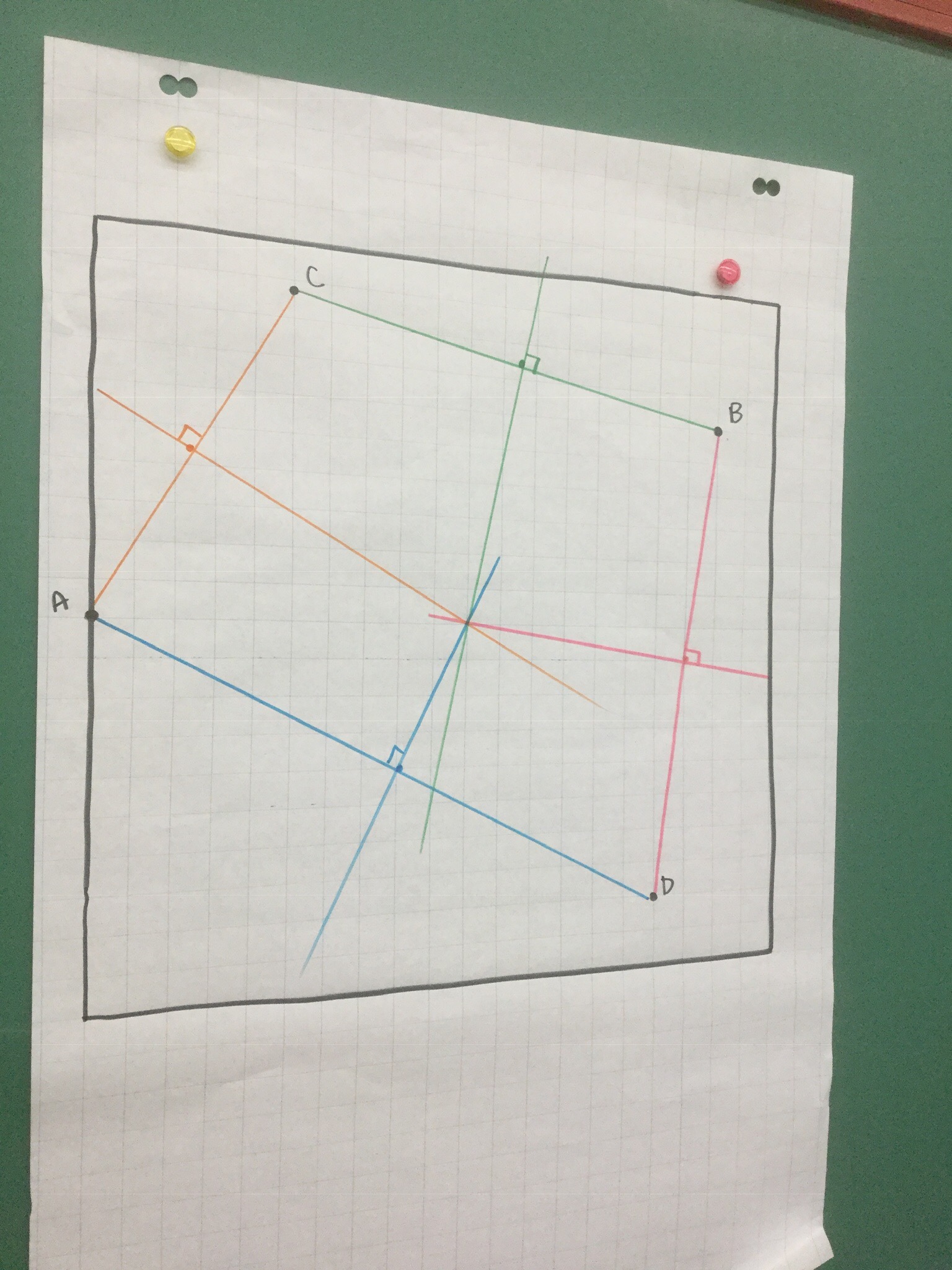 We know we can draw the “médiatrice” (perpendicular bisector) and that will show us all the points that are equidistant to the segment’s endpoints. We drew a lot of them, and noticed that they intersect!