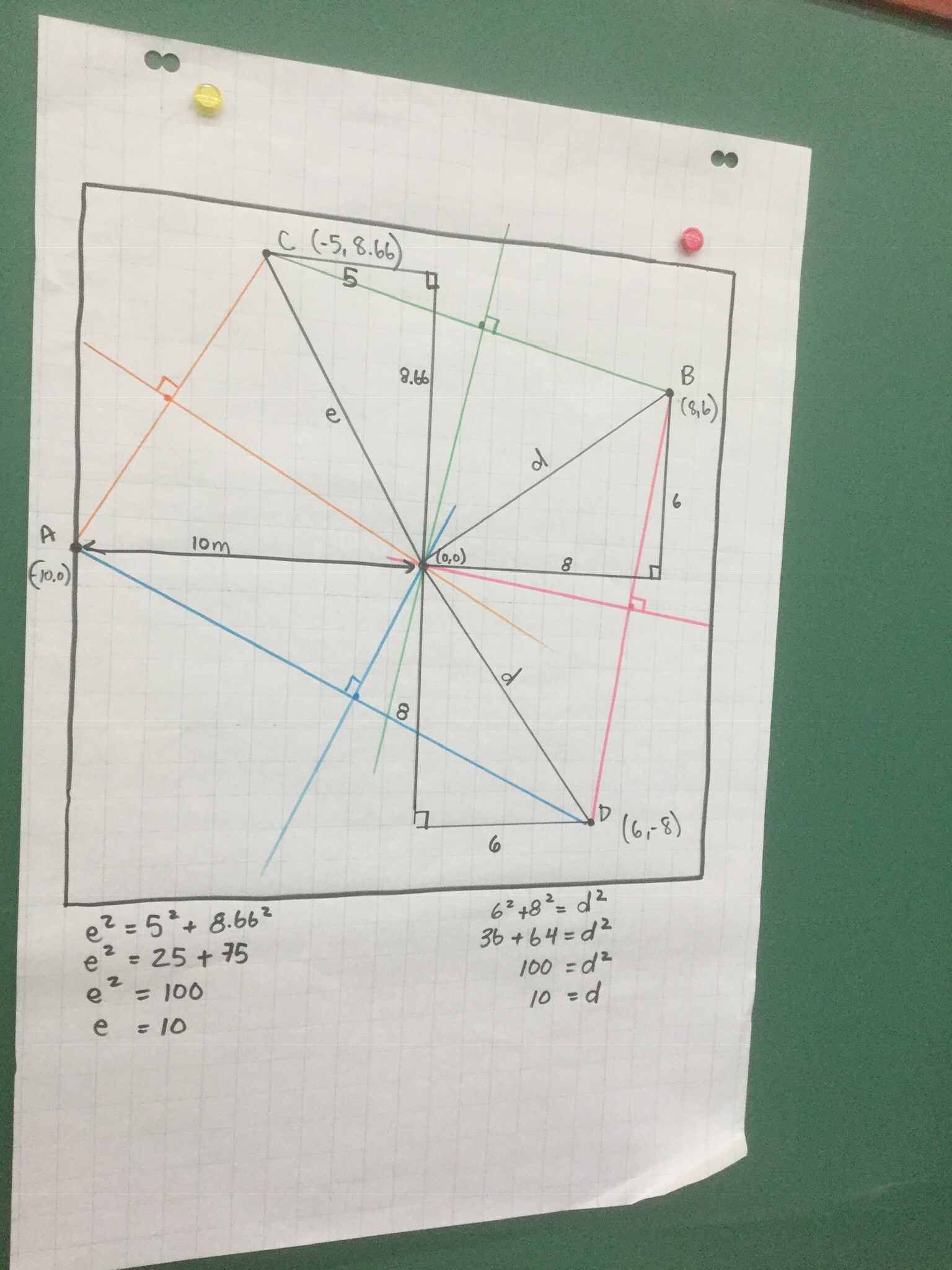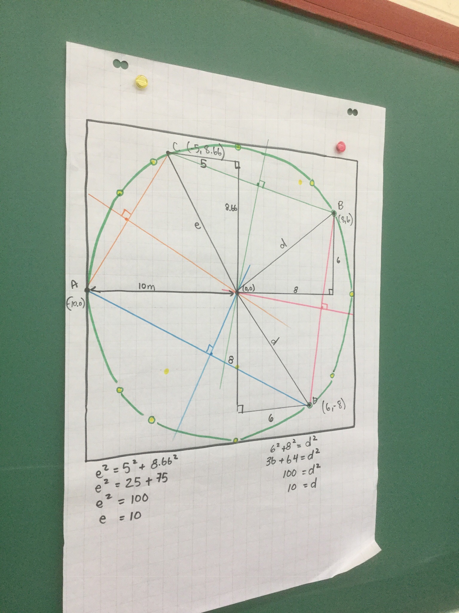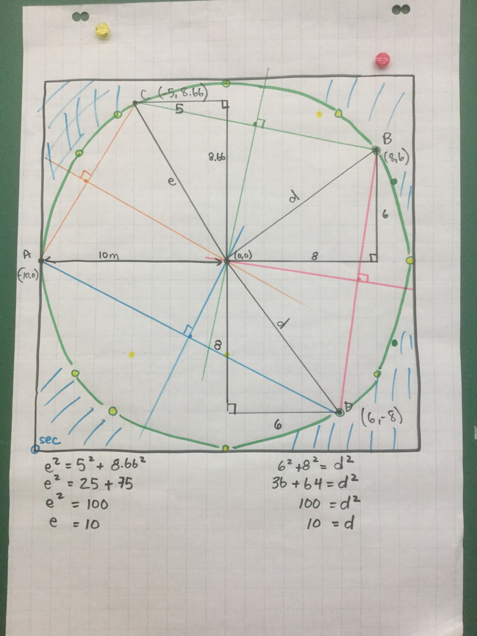 Next we looked at each point and made sure that it really was the same distance from the sprinkler. We used the pythagorean theorem or the distance formula. We called the sprinkler point (0,0)