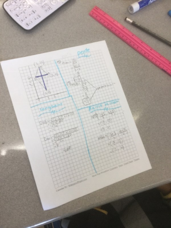 We looked yesterday at how to classify quadrilaterals using their side lengths and slopes. Today we are looking at properties of their diagonals. We drew squares, rectangles, parallelograms, rhombuses (“losanges”), trapezoids both isosceles and not, and kites. We compared their 2 diagonals to see which ones have diagonals that are perpendicular, congruent, and have the same midpoints.