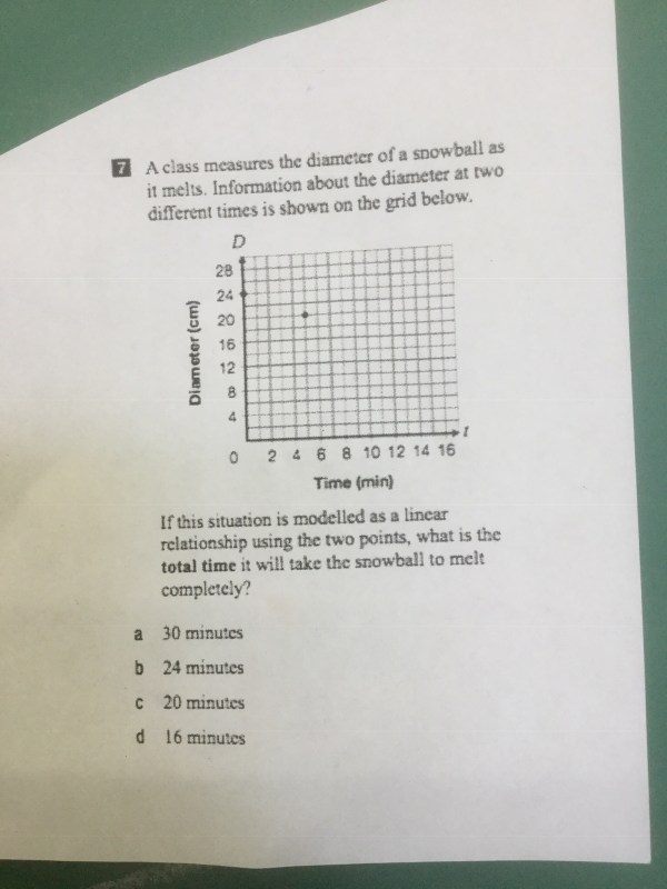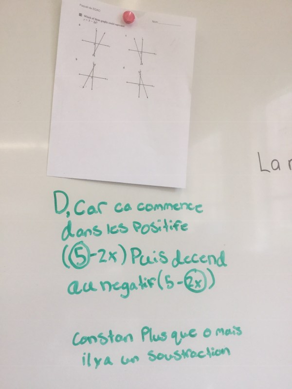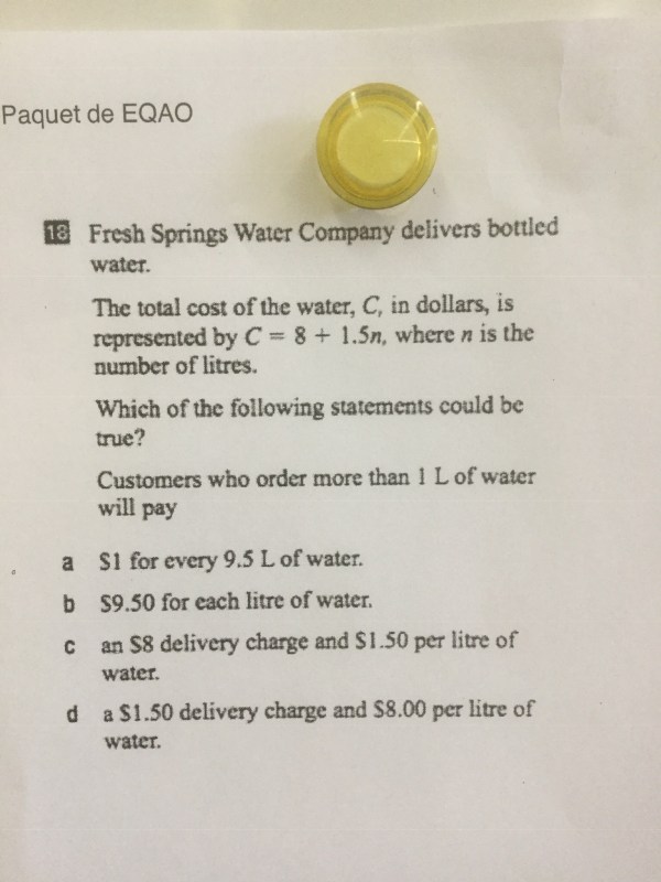 In grade 9 there is a provincial test at the end of the term. We are doing some practice today with multiple choice questions dealing with linear relationships.