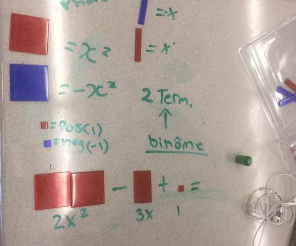 Grade 9s worked today with algebra tiles. We learned about what each type of tile means, and what a trinomial, binomial, and monomial are.