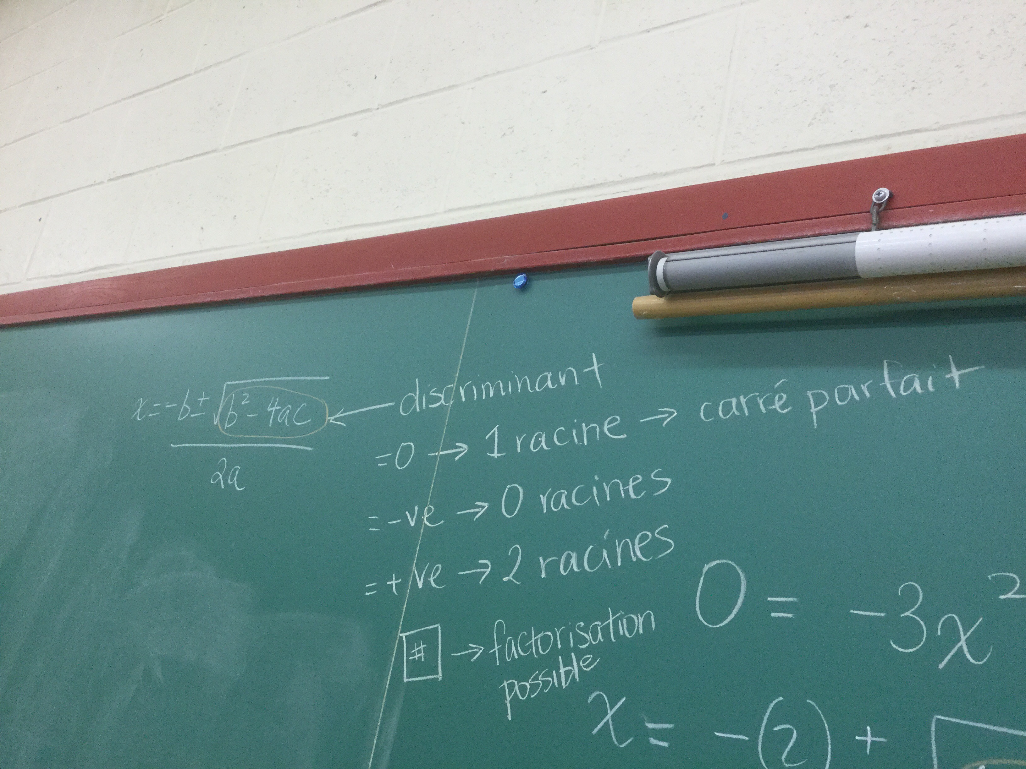 In Grade 10 today we learned all about the power of the discriminant (b^2-4ac) that is under the square root of the quadratic formula.