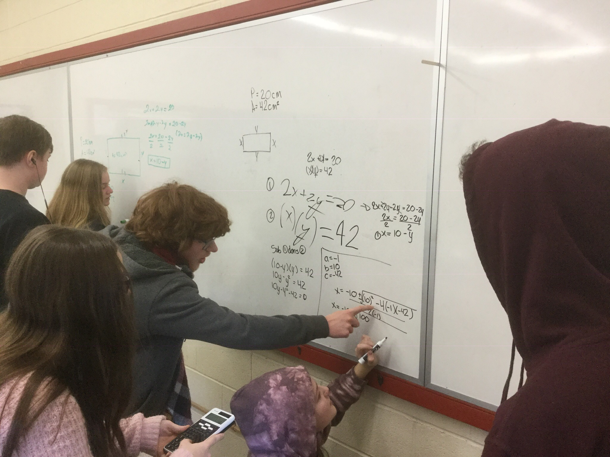 Grade 10s are working on solving problems involving quadratics. This example shows how we can determine dimensions of a rectangle given the area and perimeter. We can create equations, substitute, expand to make a trinomial, use algebra to get a trinomial that equals zero, and then use the quadratic formula to solve for the roots (if they exist).
